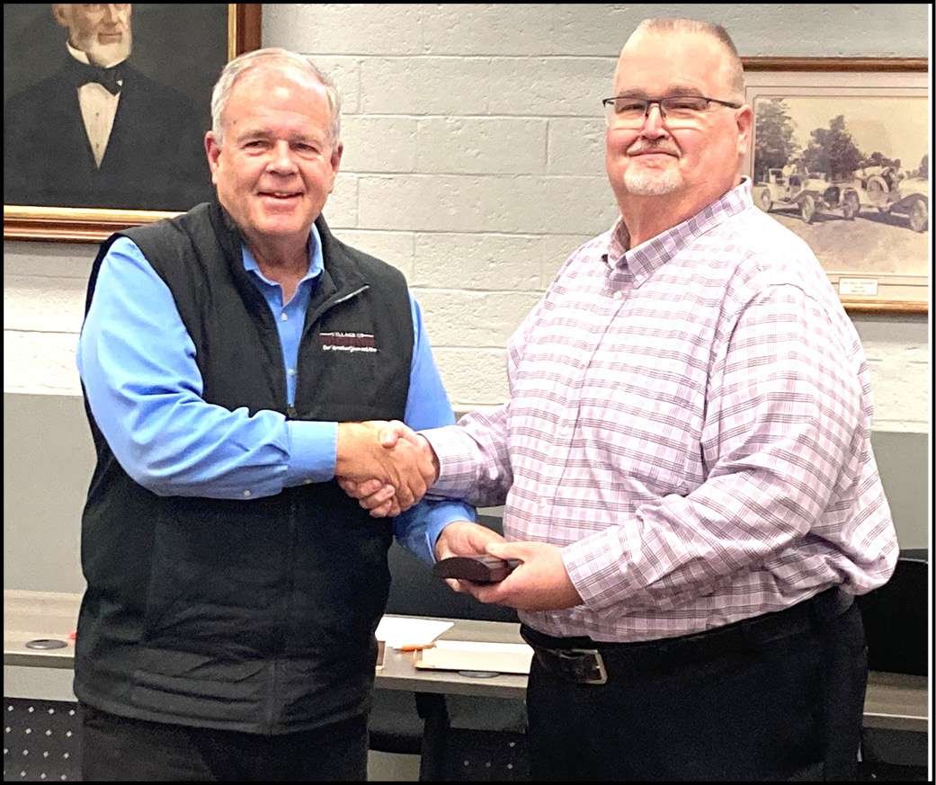 FINAL COUNCIL MEETING … Longtime Edgerton Village Council member Lance Bowsher (left) was presented with a small gift from Edgerton Mayor Bob Day (right) at the council meeting on Wednesday, December 17. It was also the final council meeting for Bowsher, who has served as mayor and council member in Edgerton for the past 21 years.