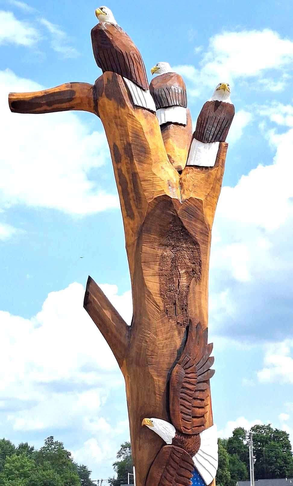 Meanwhile, Edgerton welcomed back its faithful chainsaw artist, Scott Lepley of Steuben County, who unveiled a striking new sculpture at 324 N. Michigan Avenue. The piece, featuring a convocation of bald eagles, is rich in symbolism—representing freedom, unity, strength, and spiritual vision.
