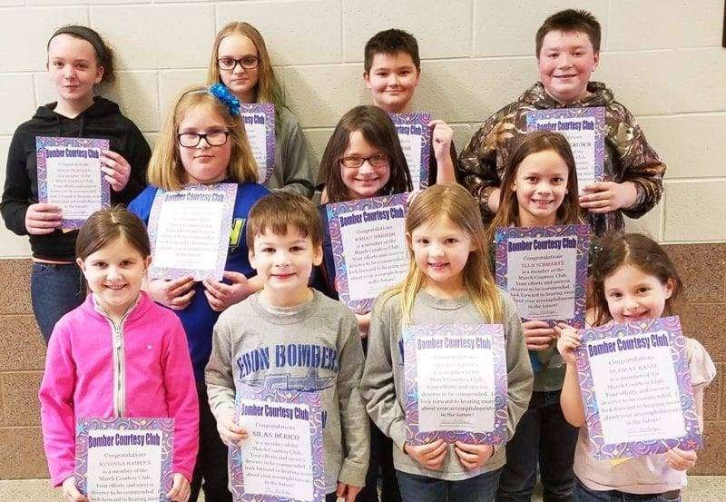 BOMBER COURTESY CLUB … Edon recently announced those selected for Bomber Courtesy Club Members for the month of March. Pictured above are (front row, left to right): Avyonna Hamrick, Silas Derico, Savannah Rice, Deziray Hanni. Middle row: Lillian Stafford, Bailey Harding, Ella Schwartz. Back row: Madison Moran, Cathrine Gibbs, Gavin Lash, Jarrett Trausch