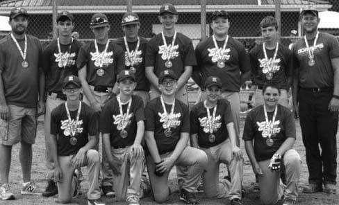 PONY LEAGUE CHAMPS … Back L-R – Coach Dye, Alex Herr, Hayden Dye, Henley Dye, Drew Gallehue, Cassius Hulbert, Ethan Steinke & Coach Lyman. Front: L-R Trenton Arnold, Dylan Bass, Terran Dunbar, Blake Dulle & Dakota Merritt (missing: Destin McCartney).