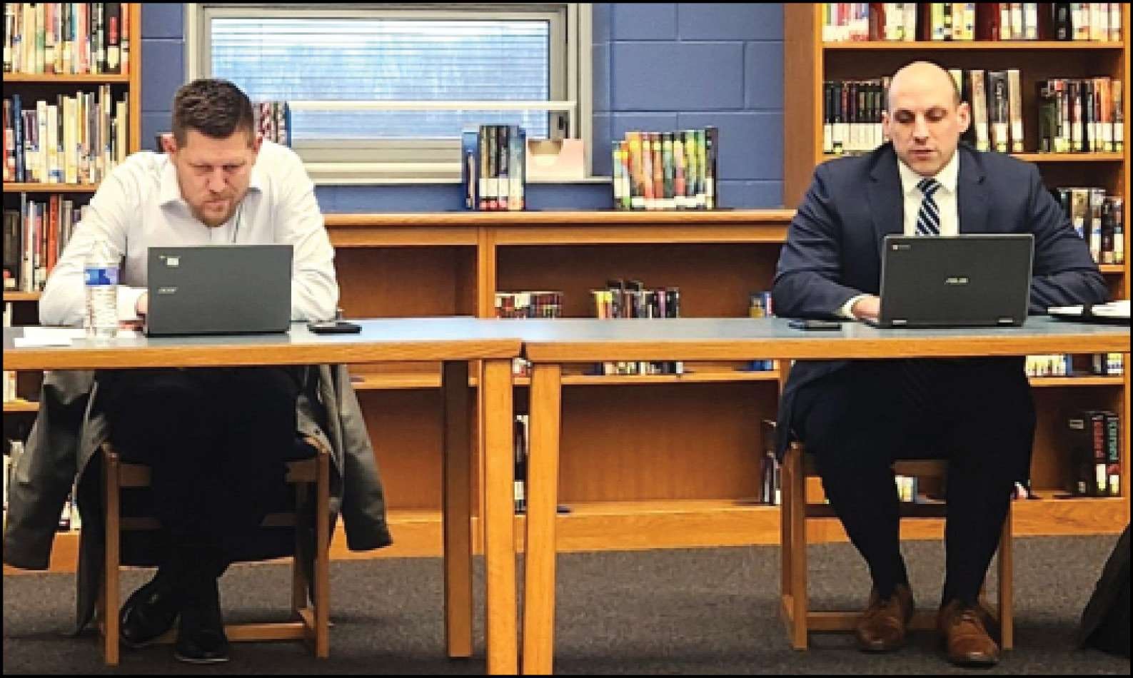 APPROVING CONTRACTS … Board President Cody Best (left) and Superintendent Anthony Stevens go over contracts awaiting approval.