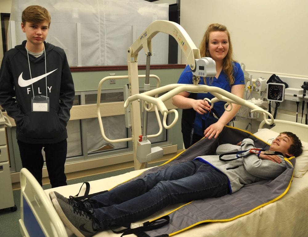 Edon Middle School 8th graders participated in “Exploring Careers Hands On for 8th Graders” (ECHO for 8th Graders) held at Four County Career Center. Career Explorers from the Career Center guided the students through several careers that were of interest to the 8th graders as they are looking forward to planning for their future. Shown above in the Health Careers lab are (LEFT TO RIGHT) 8th graders Steven Pinkham and Trey Whitney (LAYING DOWN) with Career Explorer Mckenna Trausch. ECHO for 8th Graders is made available to all 8th graders in the four county area.