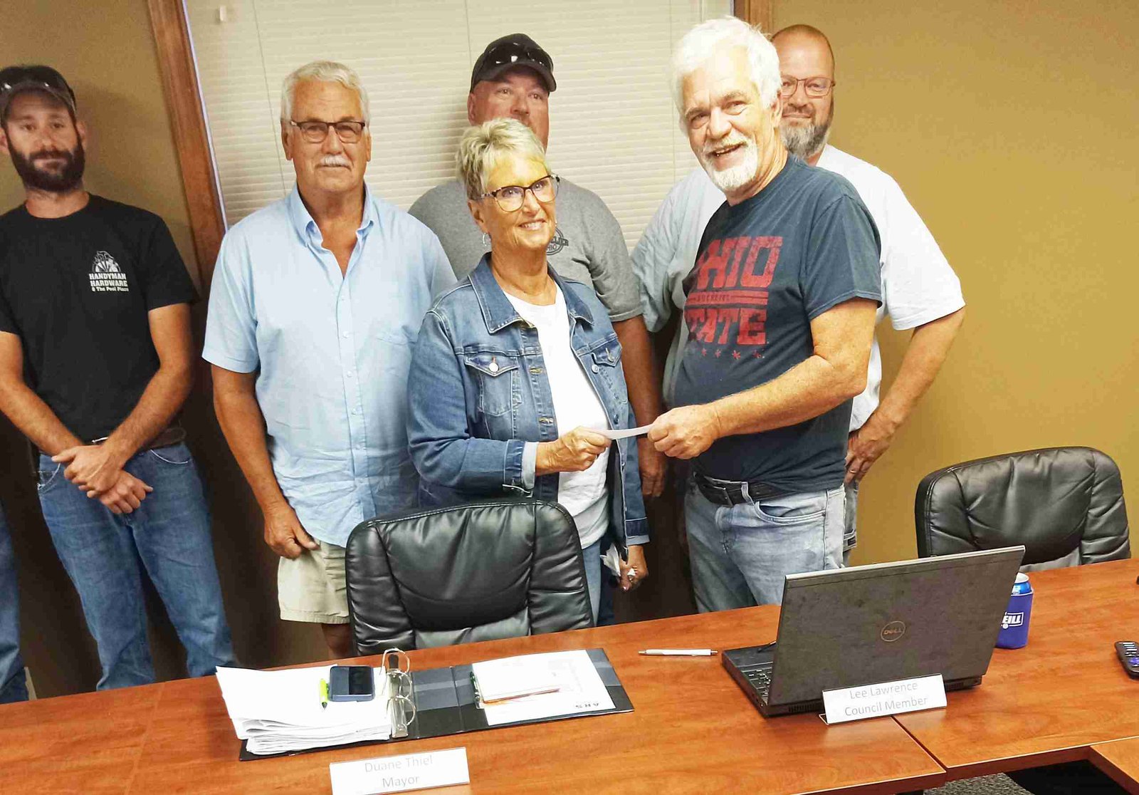 PARK PROJECT FUNDS … Susan Thiel hands Lee Lawrence, president of Edon Parks, a $5,000 check which will go towards stage two of the Walz Park Project. In the back row are, left to right, Austin Thiel, Mayor Duane Thiel, Dan Ankney and Village Administrator Chad Ordway. (PHOTO BY DANIEL COOLEY, STAFF)