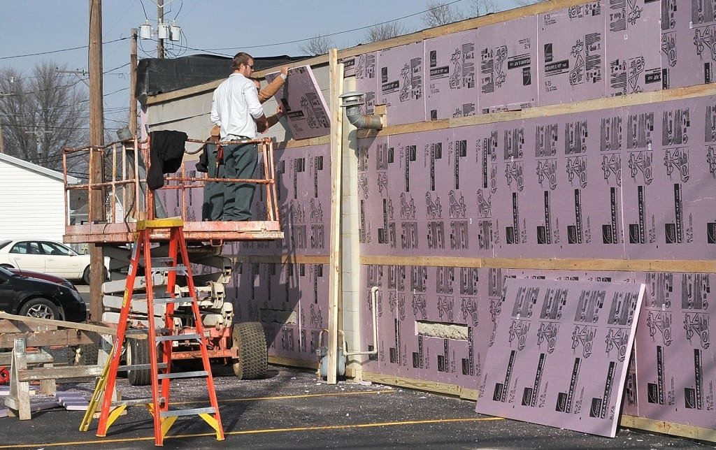 NEARING COMPLETION… Thiel Construction crew members took advantage of warm temperatures to complete the final phase of the 2012 Edon Village Hall Project. The newly-sided building houses two vehicle bays and storage areas for various Village departments.