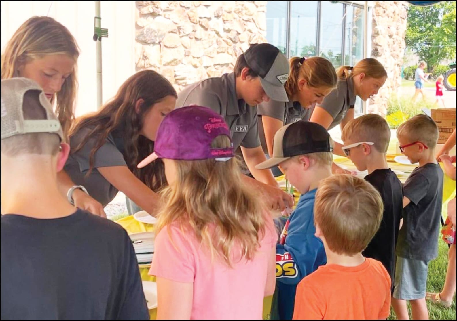 HELPING OUT … FFA members (left to right) Kate, Molly, Callie, Nate, Taylor, Carson, and Meegan assisted kids by creating an agricultural craft as part of the Truland Family Day.