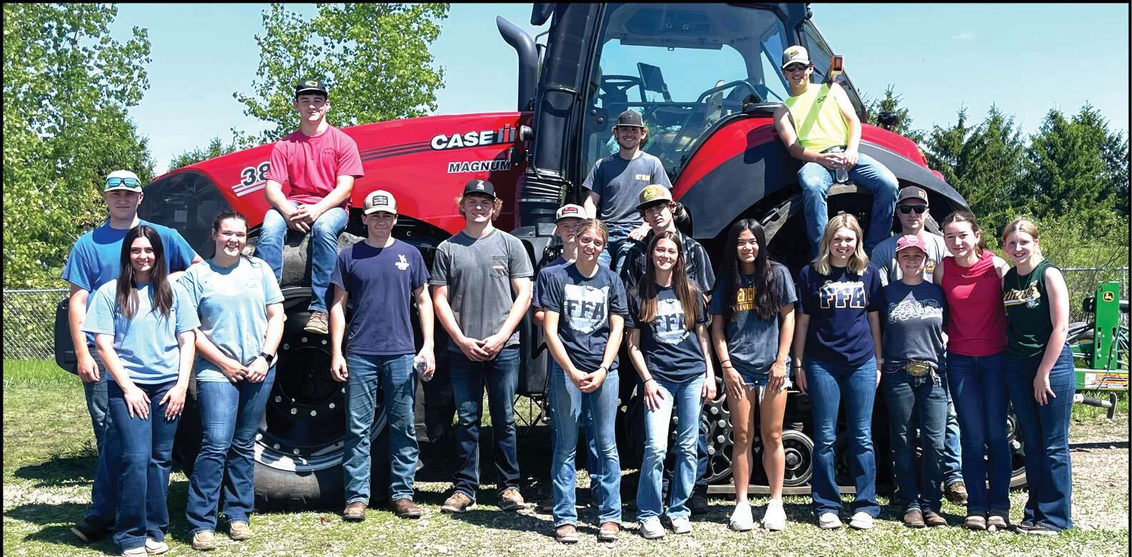 AGRICULTURE DAY … The Evergreen FFA Chapter recently held their Ag Awareness Day for their Evergreen Elementary students. This event was to inform the younger kids about agriculture and the various opportunities within FFA. The FFA chapter was able to welcome over 500 elementary students to the day. The chapter had 15 members present at the event to teach the elementary students about various agricultural topics such as livestock, how to show in a livestock ring, the purpose of farm equipment, and how to make butter. The FFA members did a wonderful job presenting to the younger students. The FFA chapter would like to give a special thank you to Conrad Family Farms and Triple H Farms for assisting us by bringing equipment to the event. Pictured are: (Left to right) Andrew Bettinger, Riley Studenka, Marlee Brubaker, Hayes Studenka, Nate Emmons, Austin Gillen, Landon Kiefer, Kate Wyse, Luke Robertson, Callie Wyse, Parker Dukeshire, Leah Elliot, Jaylin Prayter, Donivin Raker, Aylssa Marvin, Molly Elvey, Kirstyn Schroeder were the FFA members who helped with the elementary agricultural day.