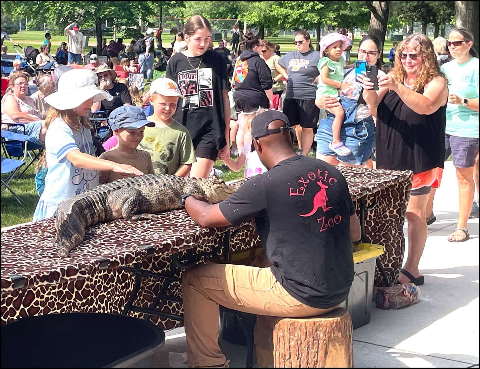 ALLIGATOR ALLEY … A long line forms around the AMP, with well over 100 people eager to pet the alligator.
