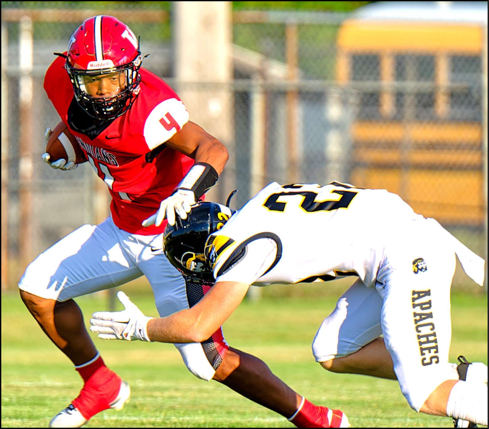 AVOIDING THE TACKLE … A’Zarrion Hicks tries to fend off an Apache tackler on a first half carry.