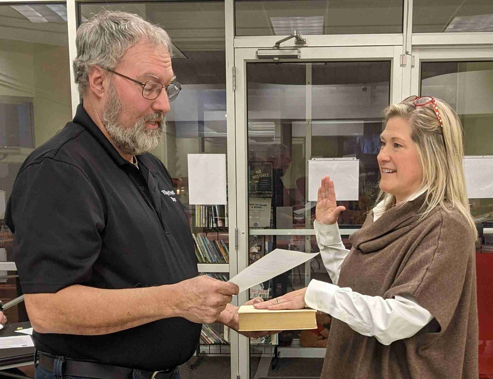 WELCOME ABOARD … Kimberlee Priestap is sworn into office by Fayette Mayor David Borer. (PHOTO PROVIDED)