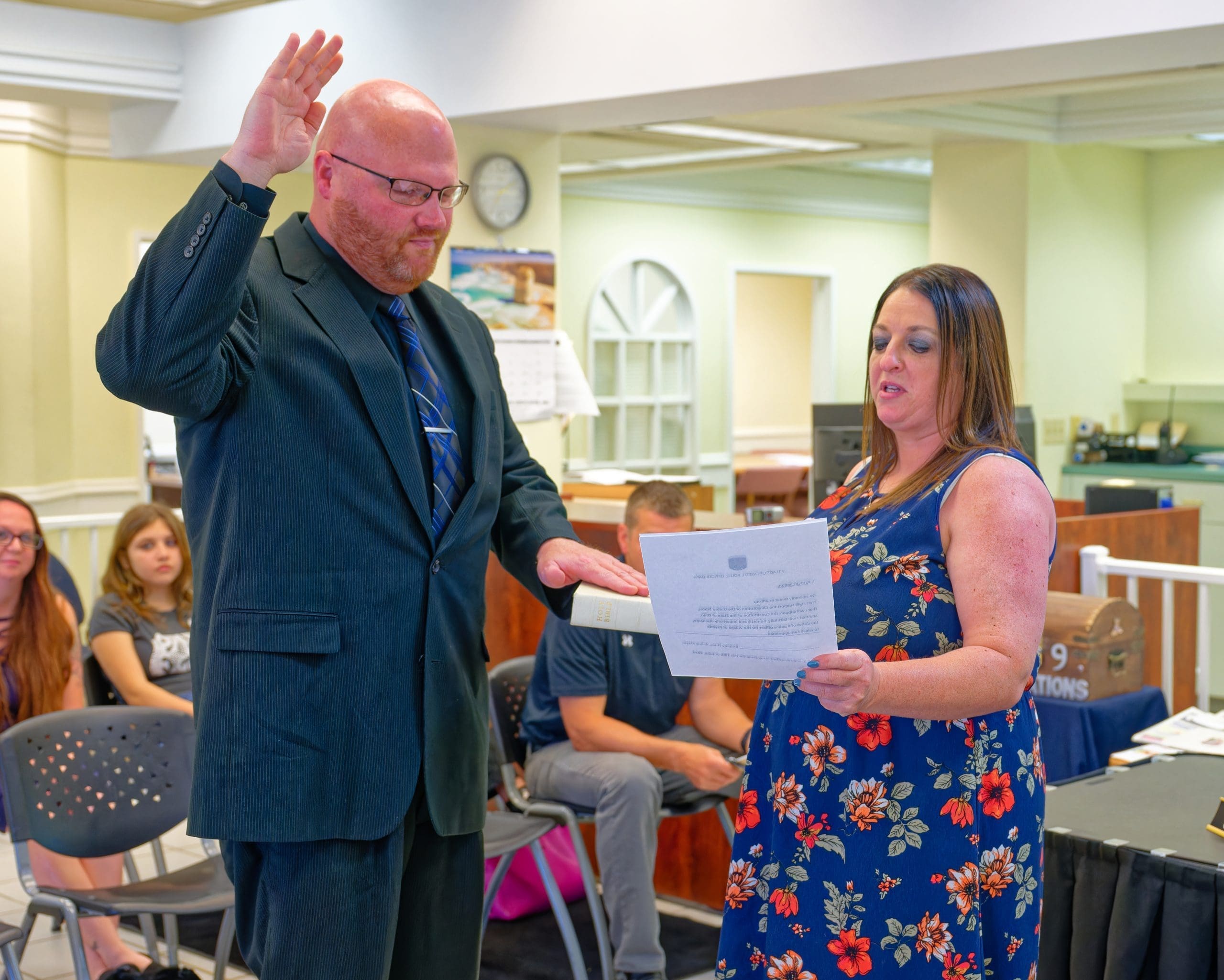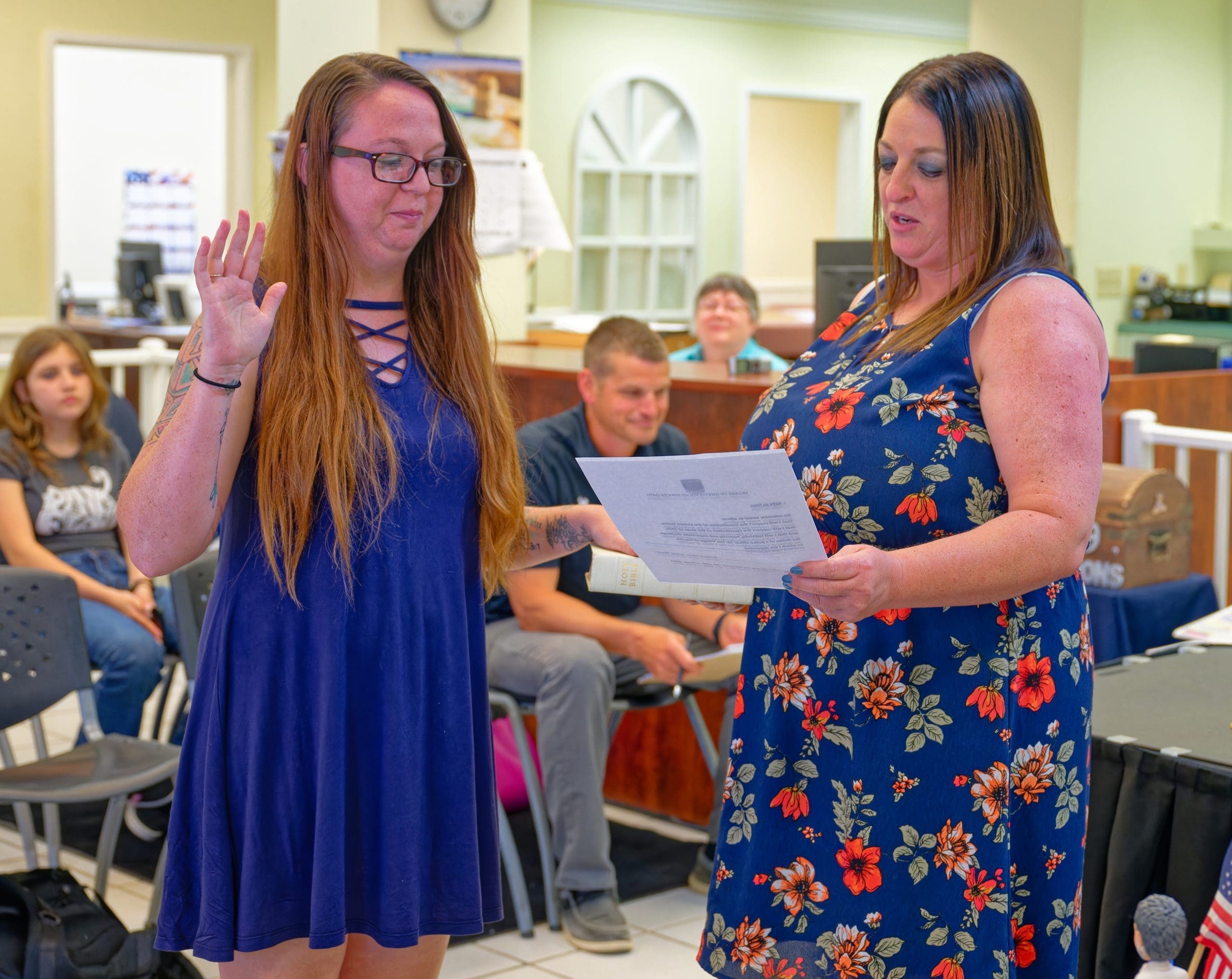 FOOR … Kelly Foor is sworn in by acting Mayor Theis as one of the village’s newest part-time police officers.