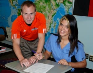 celebration of Constitution Day, students at Four County Career Center participated in the Ohio First Vote student registration. Students who will be 18 years and older by November registered. Registrations will be delivered to each county’s Board of Elections. Government instructors Jason Blue, Todd Gambler, Dan Mundrick, and Greg Wesche coordinated the day. Shown during the registration is Heather Armstrong (RIGHT) Medical Office Technology (Fayette); assisted by instructor Mr. Mundrick (LEFT).