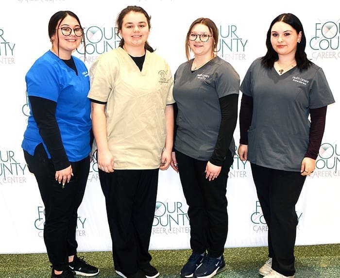 STATE COMPETITION … Thirty-two members of the Four County Career Center HOSA – Future Health Professionals Chapter have earned the opportunity to participate in the State HOSA Skill competition at the Glass City Center in Toledo on April 10 & 11, 2024. Their qualification stems from their outstanding performance, securing a position in the top four during the regional contests. Contest winners from Fulton County include (above) (LEFT TO RIGHT) Jeremiah Mermer (Archbold); Justin Sierra (Pettisville); Mariana Rodriguez (Wauseon); Jolie Barnes (Wauseon); Sofia Rodriguez (Evergreen); Jazlyn Nelson (Evergreen); and Addisyn Grooms (Archbold). Absent from the photo are Sophie Croninger (Wauseon); and Laila Deeds (Delta). Contest winners from Williams County (below) include (LEFT TO RIGHT) Janelle Degraffenreid (Stryker); Jordan Durbin (Bryan); Alivya Fry (Montpelier); and Emma Barraco (Bryan). Absent from the photo are Gracie Jinkins (Bryan); and Halle Six (Bryan). HOSA – Future Health Professionals members from various regions of Ohio will compete for awards and the right to advance to National skill and leadership contests. HOSA – Future Health Professionals Advisors are Donna Badenhop (Health Careers), Robin Hill (Health Careers), Mike Nye (Exercise Science & Sports Medicine), and Stephanie Pippin (Veterinarian Assistant).