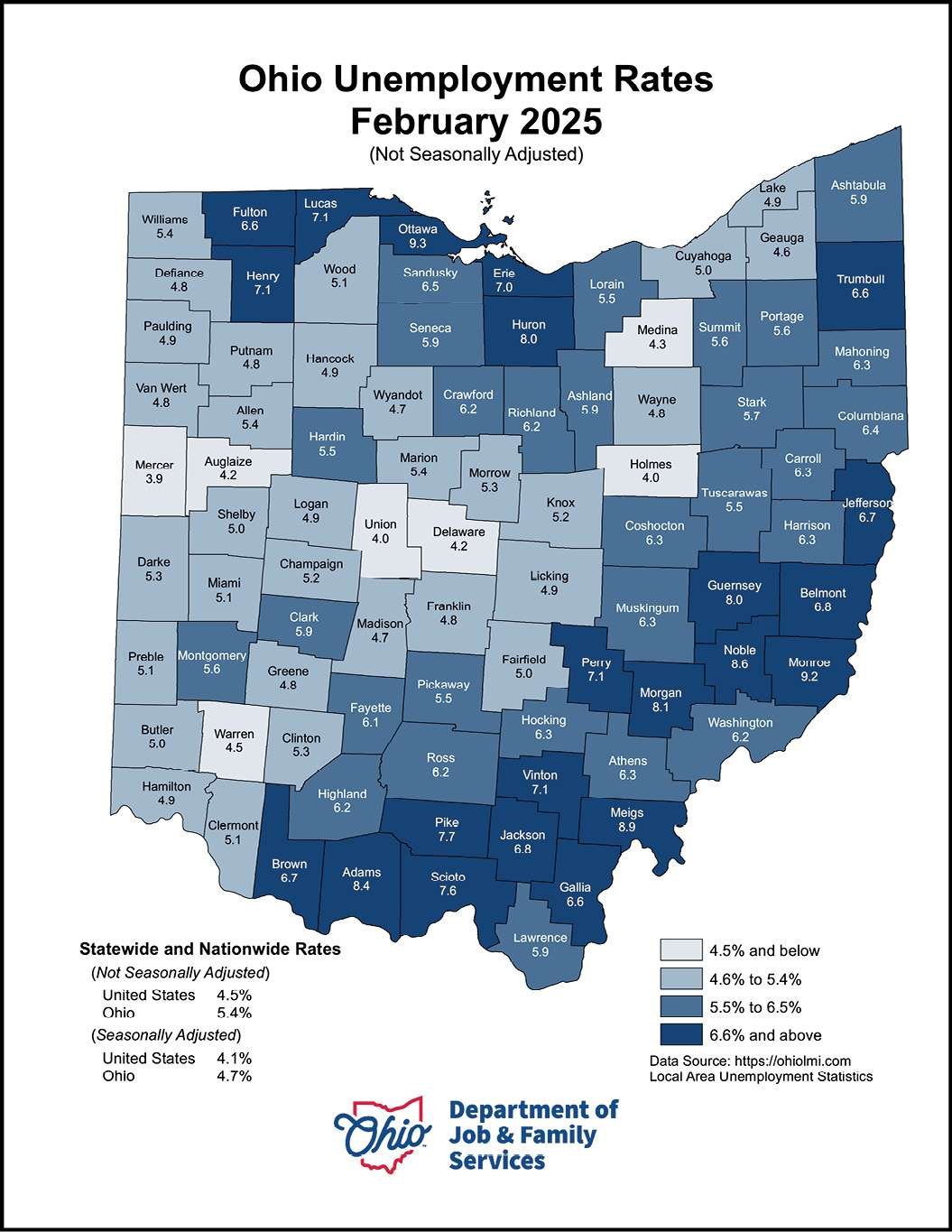Unemployment numbers for February 2025 were previously released by the Ohio Department of Job and Family Services. The latest data indicates unemployment has stayed mostly the same.