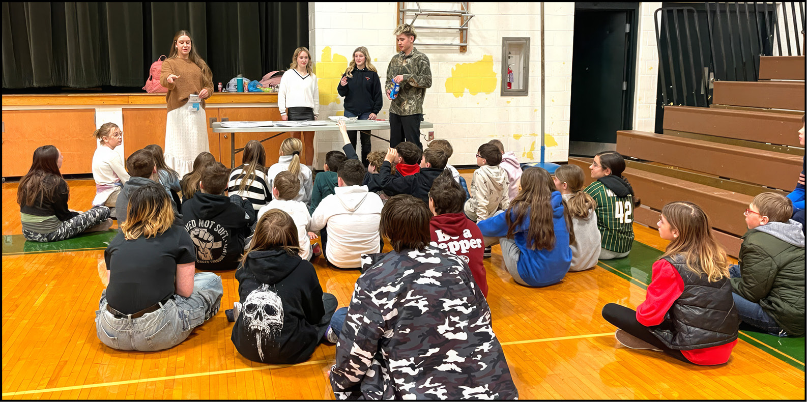 SAFETY LESSONS … The Evergreen FFA hosted an Agricultural Safety Series with the Evergreen Junior High students at the beginning of February. The safety series program was presented by FFA members to Evergreen’s fifth through seventh graders. During the two-day event, junior high students learned about aspects of agriculture and how to stay safe in these areas in their own lives. The topics that were covered through hands-on activities included: weed eater safety, livestock handling safety, and meat preparation and consumption safety. Eighteen Evergreen FFA members participated in the presentations with 300 junior high students. This event has developed into a yearly program for the Evergreen Junior High students. Above, FFA members (left to right) Lyla, Bella, Kirstyn, and Gus present to junior high students about meat preparation and consumption safety.