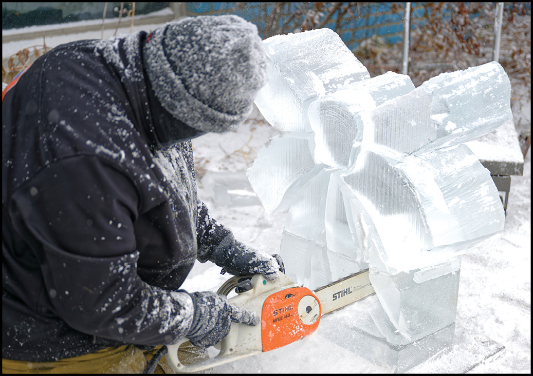 CARVING … Ice Creations of Napoleon works on an ice sculpture in front of Root Beauty and Wellness in Wauseon during the Christmas In Wauseon Ice Sculpting Event.