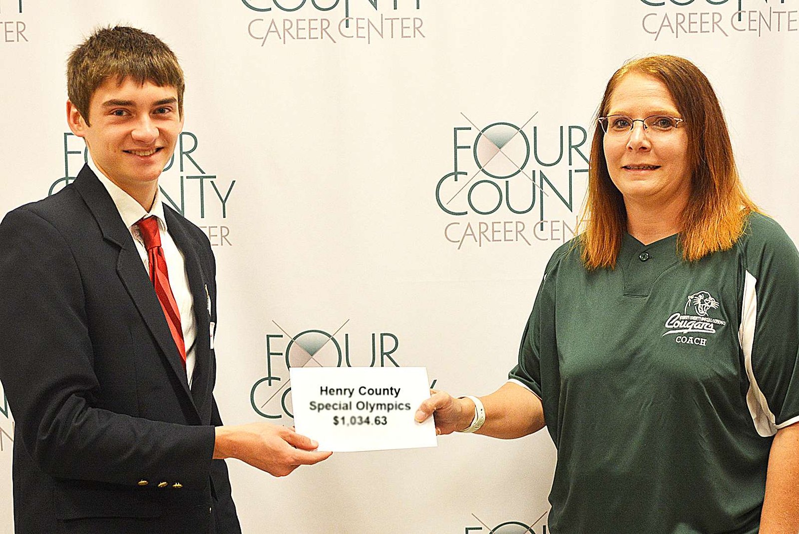 CHECK PRESENTATION … As part of the Four County Career Center’s Business Professionals of America (BPA) Chapter awards day, the Chapter was honored to present a check to the Special Olympics organizations in the four county area. Over $1,000.00 was collected throughout the school year and a check was presented to Renita Kuehner, Special Olympics Assistant Coordinator for Henry County (RIGHT) by Brendan Degryse (Fairview), BPA President. (PHOTO PROVIDED)