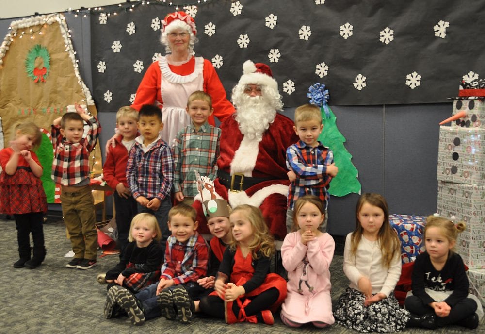 Four County Career Center Preschool/Childcare Center students presented their annual Christmas program for parents and grandparents. The Early Childhood Education students at the Career Center work with the children as part of their lab experience. Shown during the program with Santa Claus and Mrs. Claus are (FRONT – LEFT TO RIGHT) Audrey Brywczynski (Whitehouse); Tristan Bagrowski (Wauseon); Landain Rinehammer (Tiffin); Paisley Niese (New Bavaria); Bailey Barton (Napoleon); Tatum Barton (Napoleon); Sylvie Zartman (Antwerp); (BACK – LEFT TO RIGHT) Jayden Elmer (Helena); Stryker Oyer (Napoleon); Briggs Zartman (Antwerp); Isaac Meyer (Cecil); Dawson Martz (Archbold); Santa Claus; and Lucas Helberg (Napoleon). Mrs. Claus is standing in the back. The preschool is run under the direction of Early Childhood Education instructor Susan Myers along with Preschool Staff Person Katelyn Flanary and Education Aide Jennifer Hutchison.