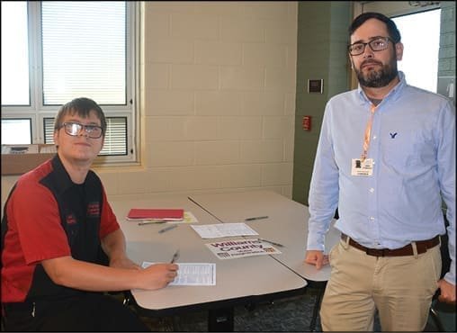 RIGHT TO VOTE … In preparation for the November General Election, students at Four County Career Center participated in Constitution Day student registration. Mary Detmer, Director; and Susann Sheaffer, Deputy Director; from the Henry County Board of Elections, along with April Fryman, Director; and Drew Stambaugh, Deputy Director; from the Fulton County Board of Elections, spoke to the students about the voting process and their rights and responsibilities to vote. Students who will be 18 years and older by the November election were able to register. Registrations are then delivered to each county’s Board of Elections. Shown (top photo) filling out voter registration forms are (LEFT TO RIGHT) Carlos Cadena-Ramirez (North Center) in Electrical, Gary Robinson (Montpelier) in Automotive Technologies, and Donimic Gill (Edgerton) in Automotive Technologies assisted by Mary Detmer and pictured above is Alex Bolaney (Powersports) a Pettisville student assisted by Drew Stambaugh. Career Center Government instructors made the arrangements for the presentation.