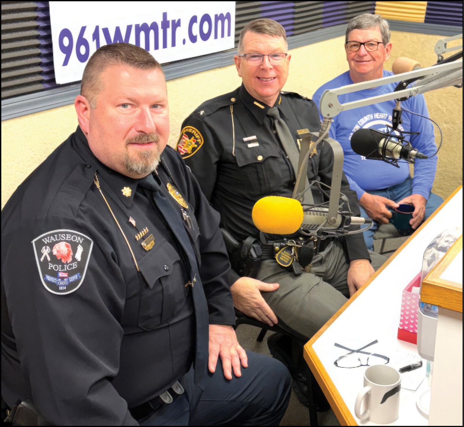 GUEST DJS … Front to back: Wauseon Assistant Police Chief Nathan Hartsock, Fulton County Sheriff Roy E. Miller, and retired judge Jeff Robinson were among the guest DJs who spent an hour taking pledges and requests as part of the annual Fulton County Heart Radiothon.
