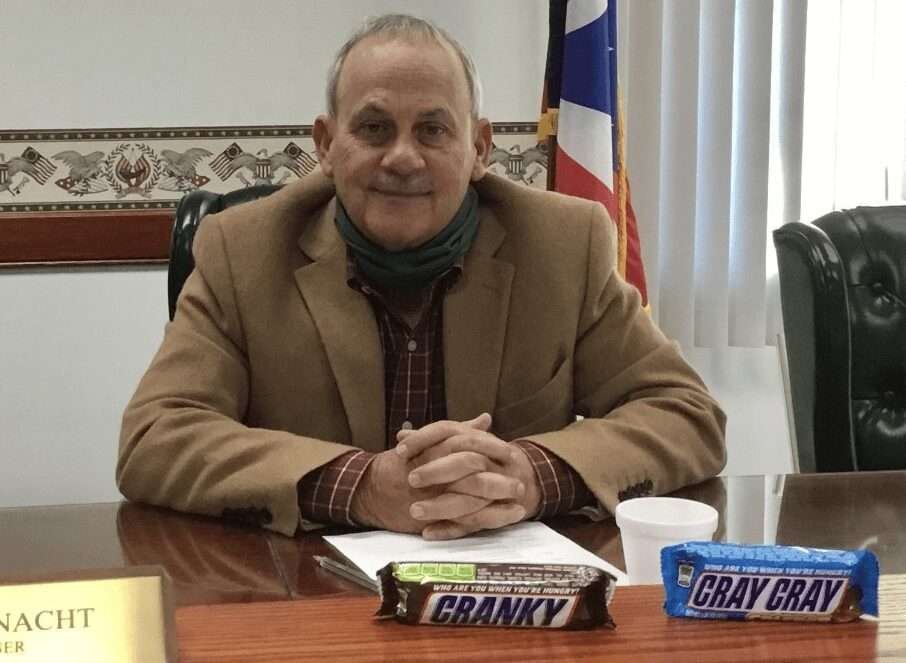 WRAPPING IT UP … Fulton County Commissioner Bill Rufenacht’s last meeting on the Board will be on December 31, 2020. He has spent the past eight years (two terms) on the Board of Commissioners and jokingly got labeled as “the grouchy one.” As part of that joke, he has been given some snickers bars that say “CRANKY” and “CRAY CRAY.” He is seen here in November 2020, with the two candy bars that are three to five years old. In reality he is a really nice guy and laughingly accepts the teasing. Mr. Rufenacht is thanked for his service and wished the best as he steps down and lets Joe Short join the Commissioners. (PHOTO BY REBECCA MILLER)