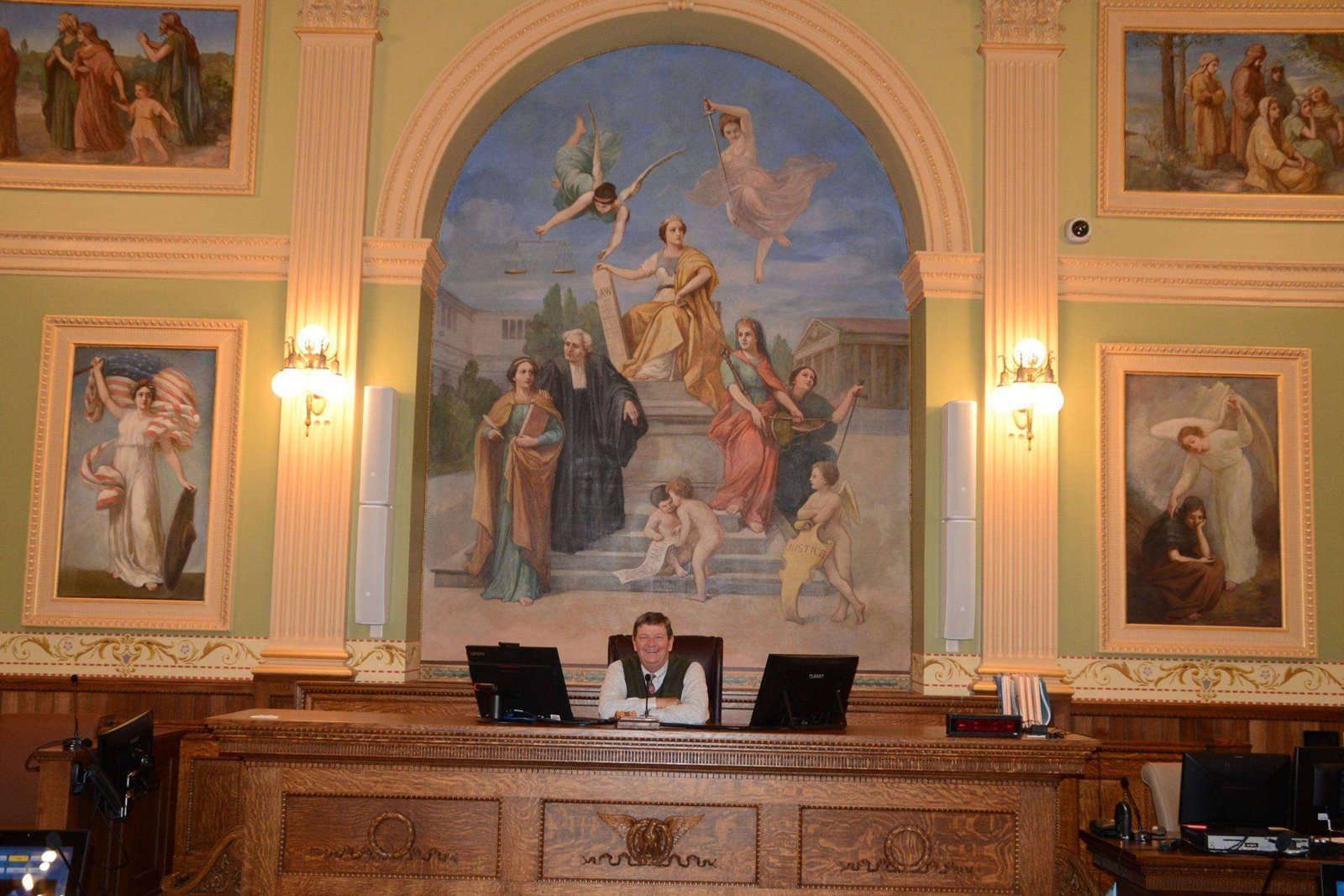 Being nearly a century and a half old, the ravages of time took their toll on the grand old structure. The murals inside the stately courtroom had darkened, and the varnish of locally sourced tiger oak bench where judges passed down rulings for nearly 150 years had turned black. The building was in need of significant renovations, restorations and upgrades, both inside and out. In 2018, Mosser Construction and the John Canning Company began the process of restoring the classic Gilded Age building to its magnificence from the days of the presidency of Ulysses S. Grant.