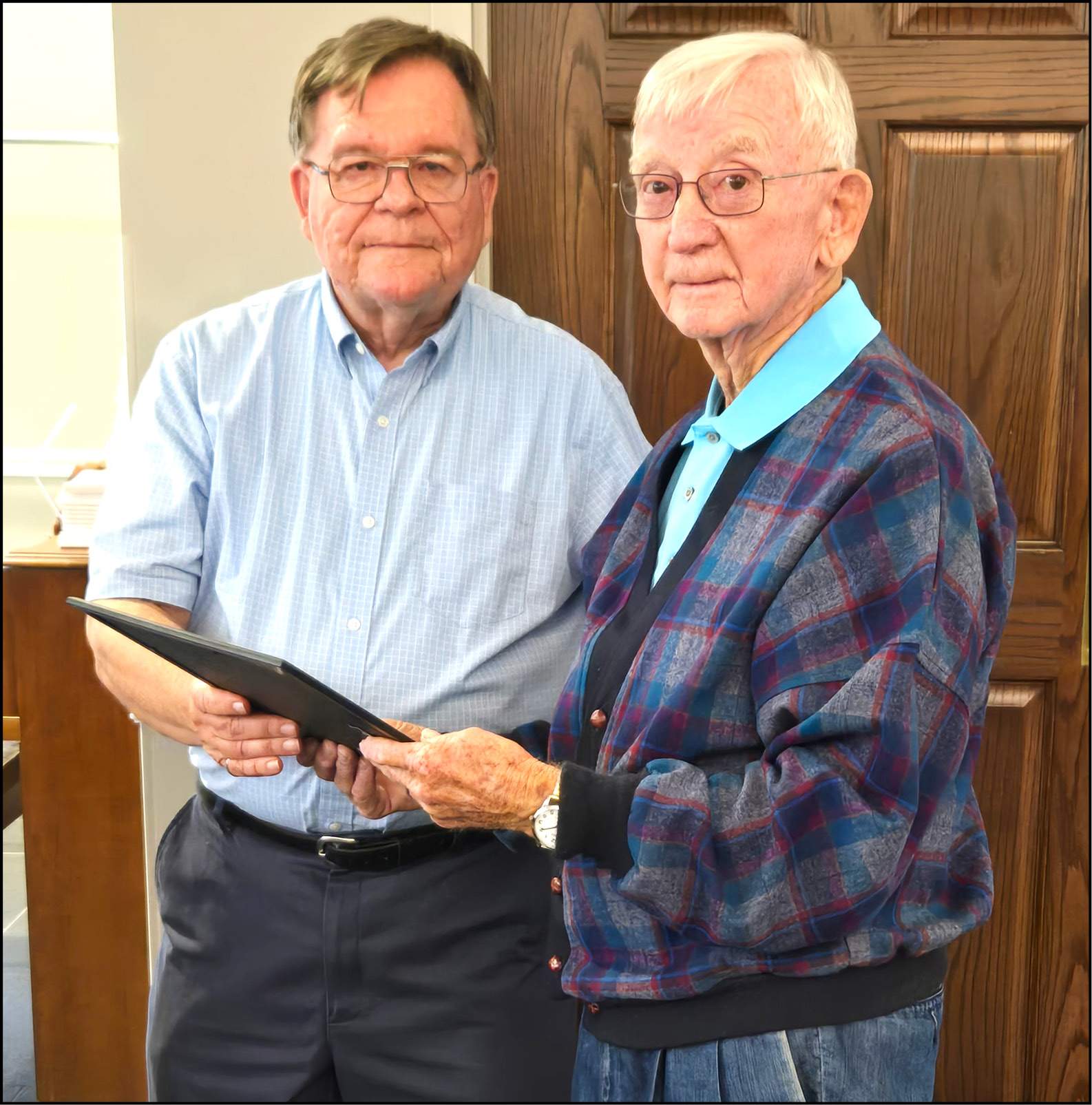 BUEHRER HONORED … Fulton County Historical Society Board of Trustees President John Myles (left) presents outgoing trustee Carl Buehrer (right) with an award recognizing his service. The presentation was made during the historical society’s annual meeting and dinner on October 7.