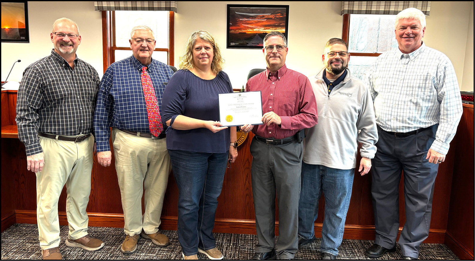 AUDITOR AWARD … Fulton County received a Clean Audit Award on Tuesday, December 23, 2025, from the Ohio Auditor of State Office in recognition of a clean audit. According to the state office website, the designation means the county’s audit report contained no findings for recovery, material weaknesses, significant deficiencies, questioned costs, or material citations. During the presentation, Scott Sands of the State Auditor’s Office noted that roughly 6,000 entities are audited and only a small percentage earn the award. He then offered his congratulations to Fulton County for receiving the recognition. Pictured from left to right: Joe Short, Jon Rupp, Charlene Lee, Brett Kolb, Scott Sands – State of Ohio Auditor’s Office, Jeff Rupp.