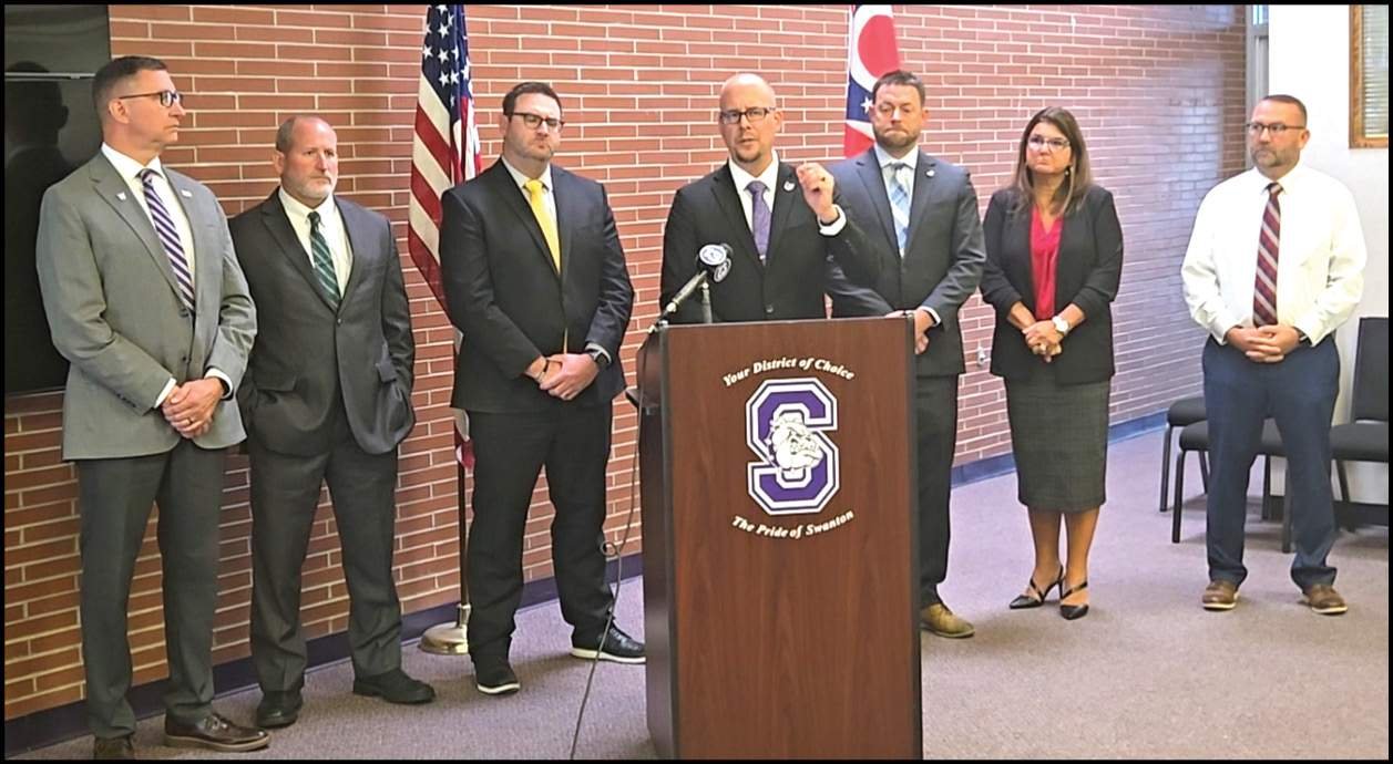 TAKING A STAND … Swanton Local School District Superintendent Chris Lake (center) speaks during a press conference Thursday on the possibility of school district consolidation in Ohio. He is joined by (from left) Wauseon Exempted Village School District Superintendent Troy Armstrong, Evergreen Local Schools Superintendent Eric Smola, Pettisville Schools Superintendent Josh Clark, Archbold Area School Superintendent Dr. Jayson Selgo, Fayette Local School District Superintendent Dr. Angela Belcher, and Pike-Delta-York Local School District Superintendent Doug Ford.