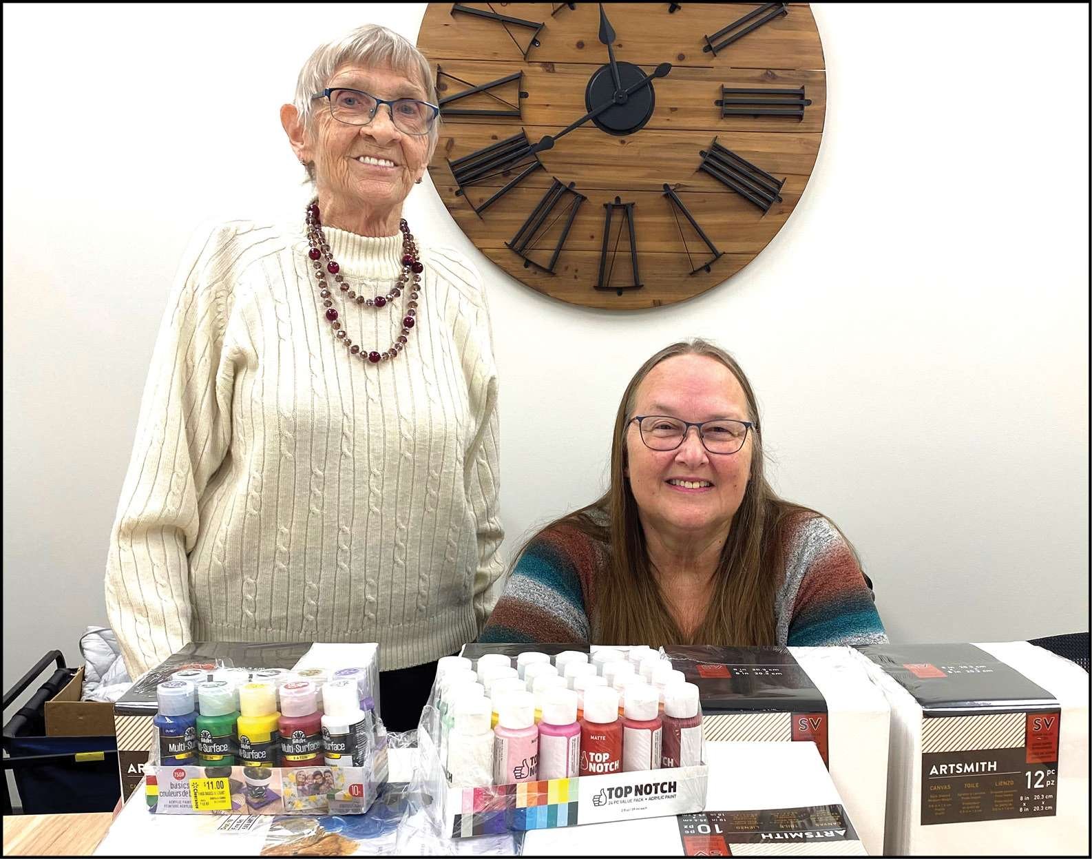 Linda Miller and Cheryl Helberg, representing Lyons Live & Learn Club of Fulton County, and Ohio Homemakers and Community Education, donated 74 paint canvases, and 34 bottles of acrylic paint for our seniors to use at painting classes.