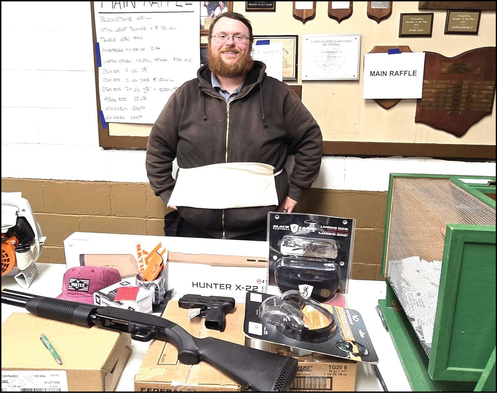 RAFFLES GALORE … Fulton County Sportsmen’s Club Range Manager and Vice President Peter Hayes stands behind the main raffle table during the club’s annual Coon Supper. Among the items at the main table were a Mossberg Maverick 12-gauge shotgun and a Taurus G3C 9-millimeter handgun.