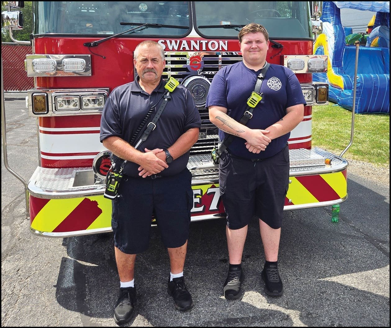 LIGHTS AND SIRENS … Swanton Fire and Rescue firefighter/EMTs Nick Meko (left) and Dalton Richard (right) show off a fire engine to attendees at Wednesday’s family fun fair at the Swanton Valley Rehabilitation and Healthcare Center.