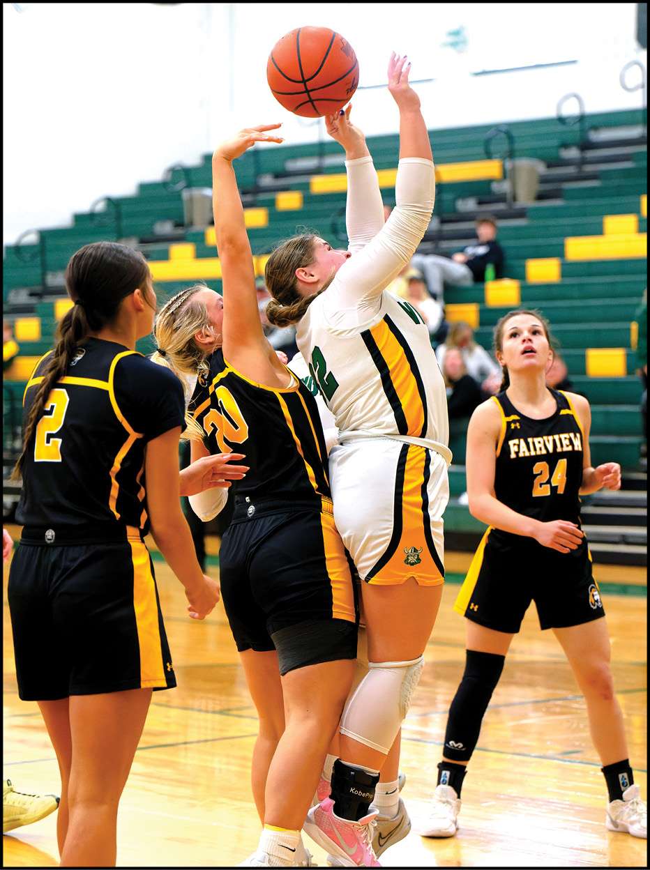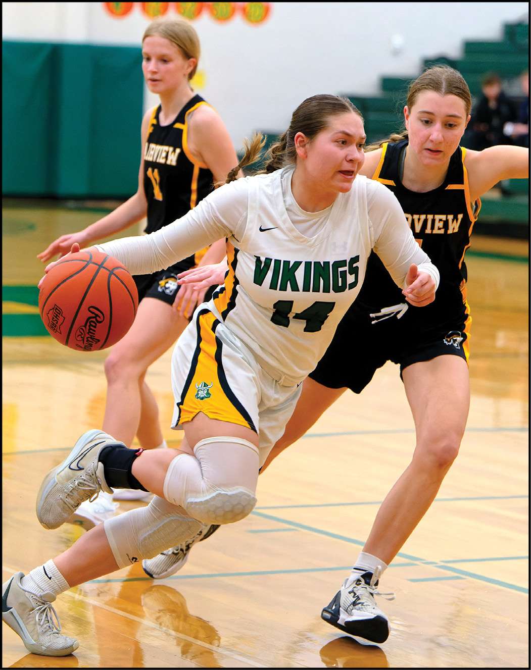 The Vikings took a 26-12 lead into the locker room and extended that margin in the third. Kyla Risner’s three-pointer, Avah Vaculik’s 2/2 from the line, a Burgermeister putback and Lanae Manz’s putback boosted the Vikings up 35-15.