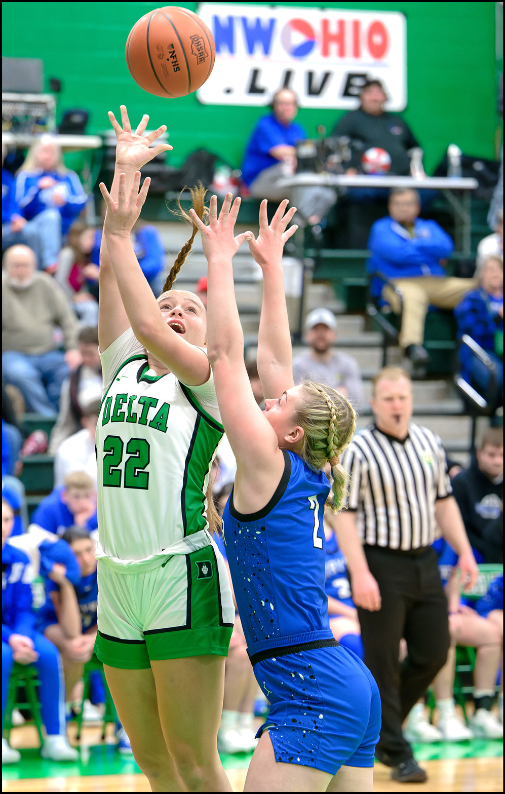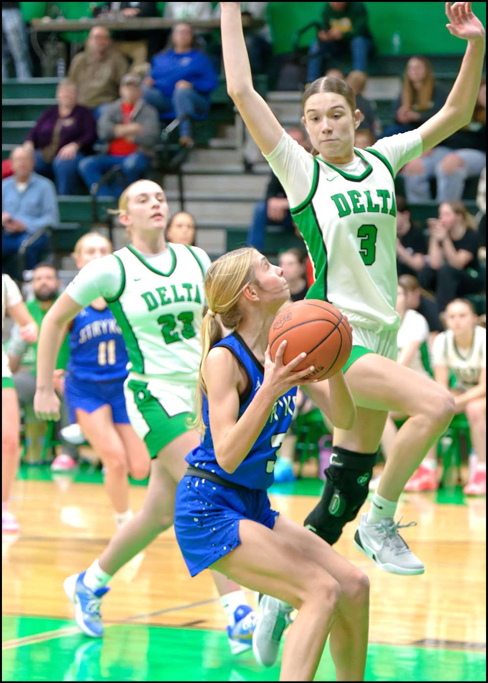 Anna Lohman stuck a right-wing triple at the 5:15 mark of the third to give Delta a 21-7 lead. Stryker scored the next six, keyed by Aubrey Clemens wing jumper to close within 21-13 but Ellie Martinez bagged one from outside the arc and Olivia Mohring scored a three-point play to regain a 14-point lead.
