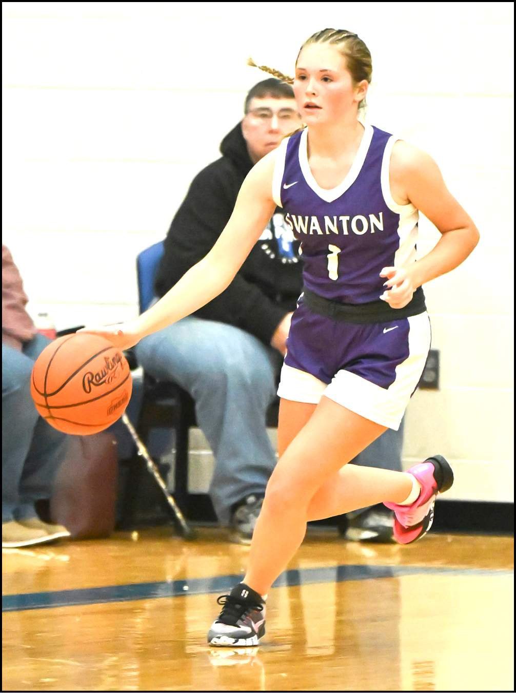 FLOOR GENERAL … Swanton’s Lexi Yeager bring the ball up the floor in Swanton’s season opener at Stryker on November 22.