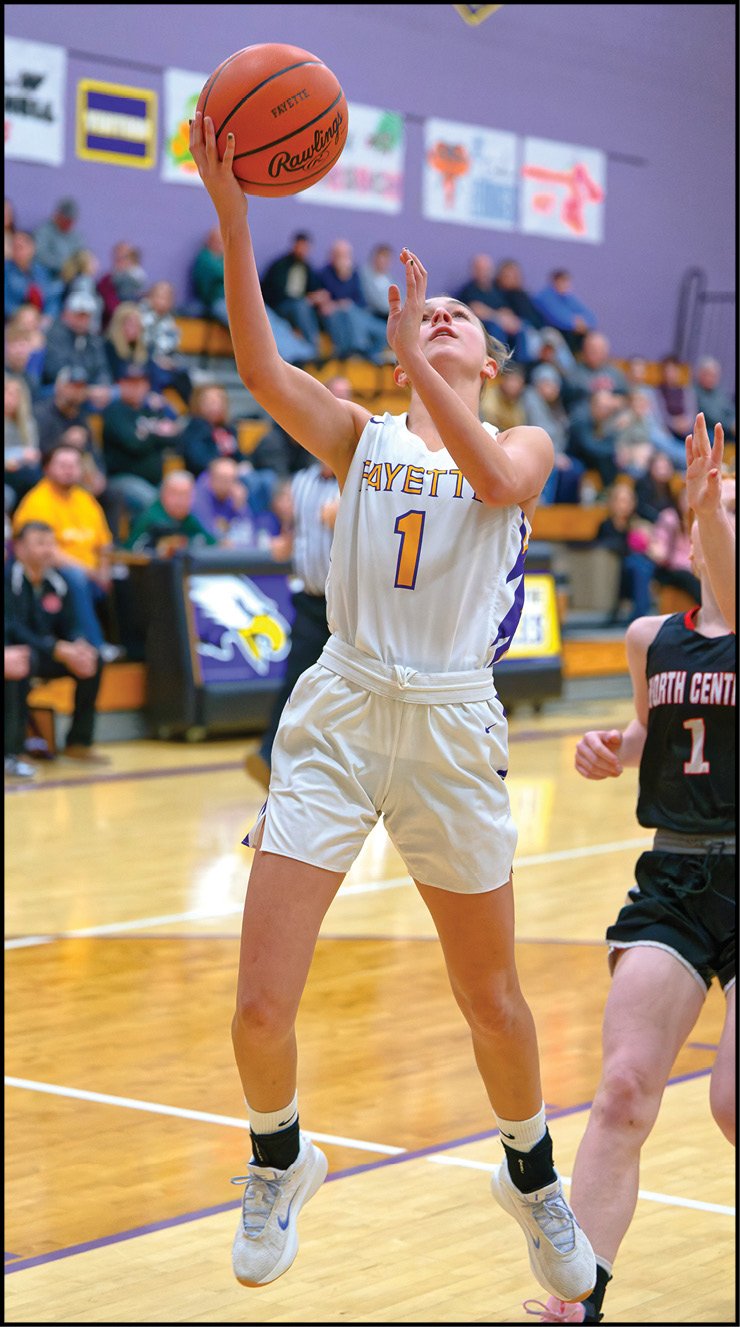 LAYUP … Fayette’s Addison Schang goes up for two of her 12 points in a 49-37 win over North Central. VIEW ALL PHOTOS OF THIS CONTEST FOR FREE AT WWW.THEVILLAGEREPORTER.COM