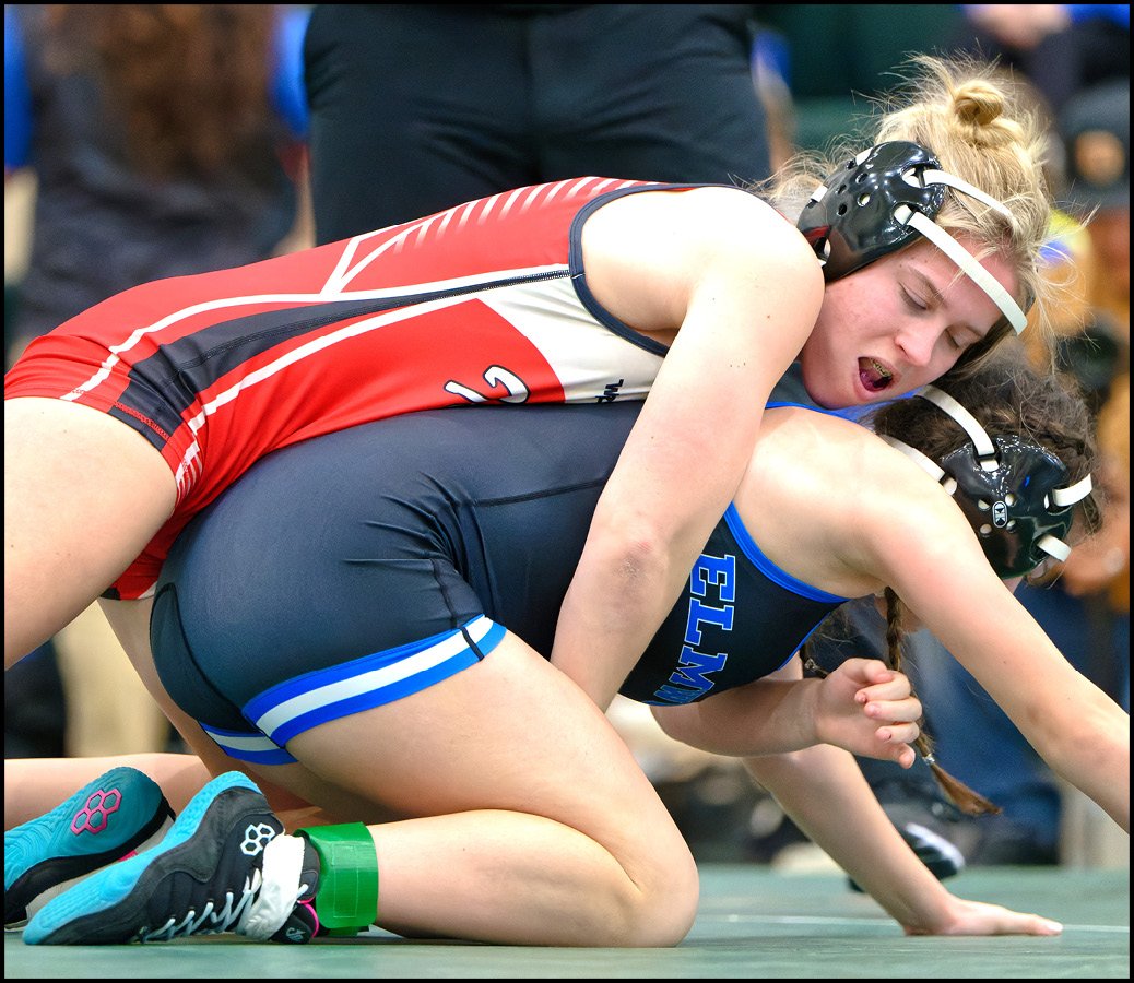 125 POUNDS … Layla Gale (white/maroon) of Edgerton takes on Emma Tobias of Crestview in a consolation second round match. Gayle got the win by fall in the first period and would go on to place sixth.