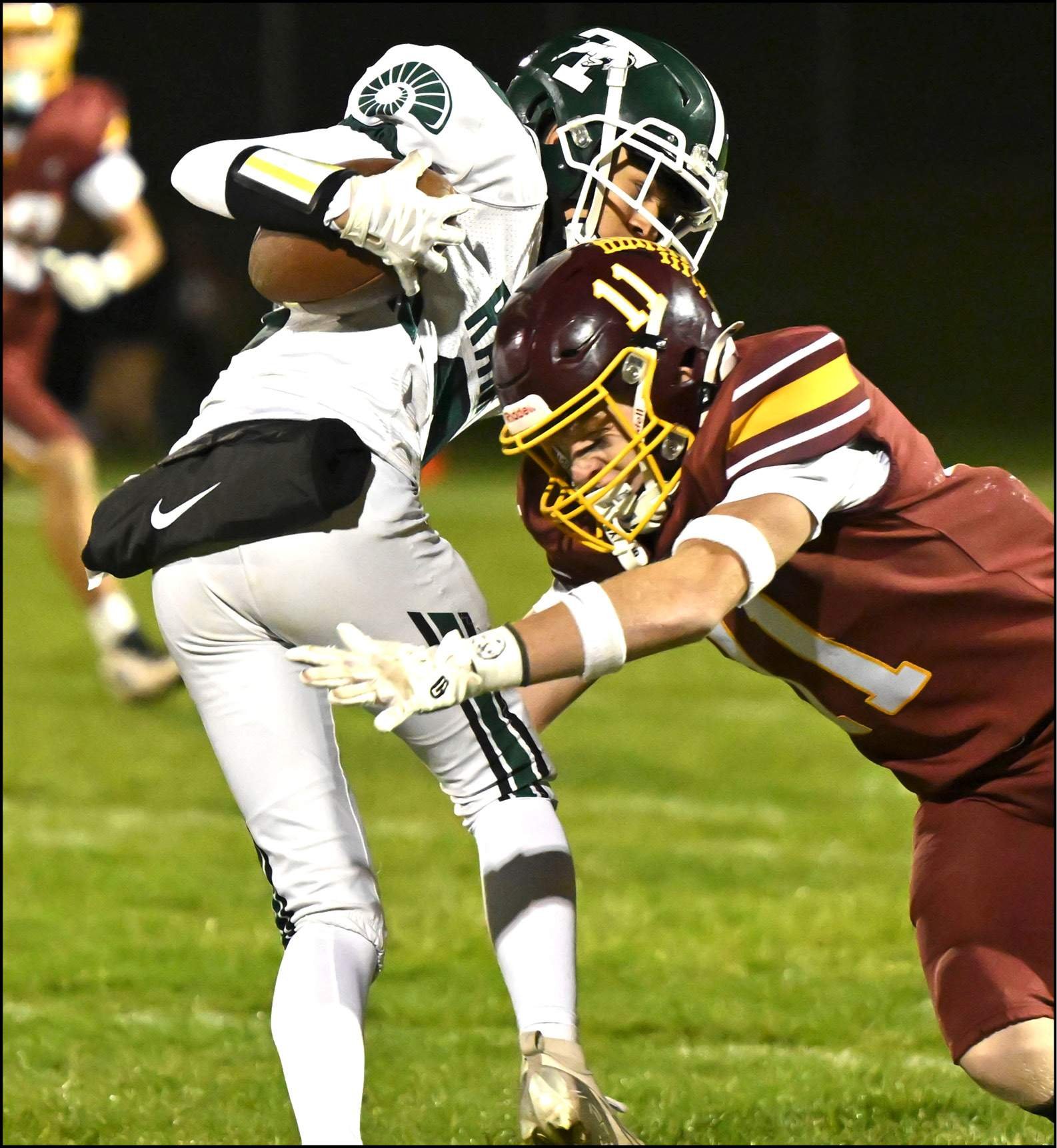 REGULAR SEASON FINALE … Edgerton’s Karter Gibson wraps up the Tinora ball carrier.