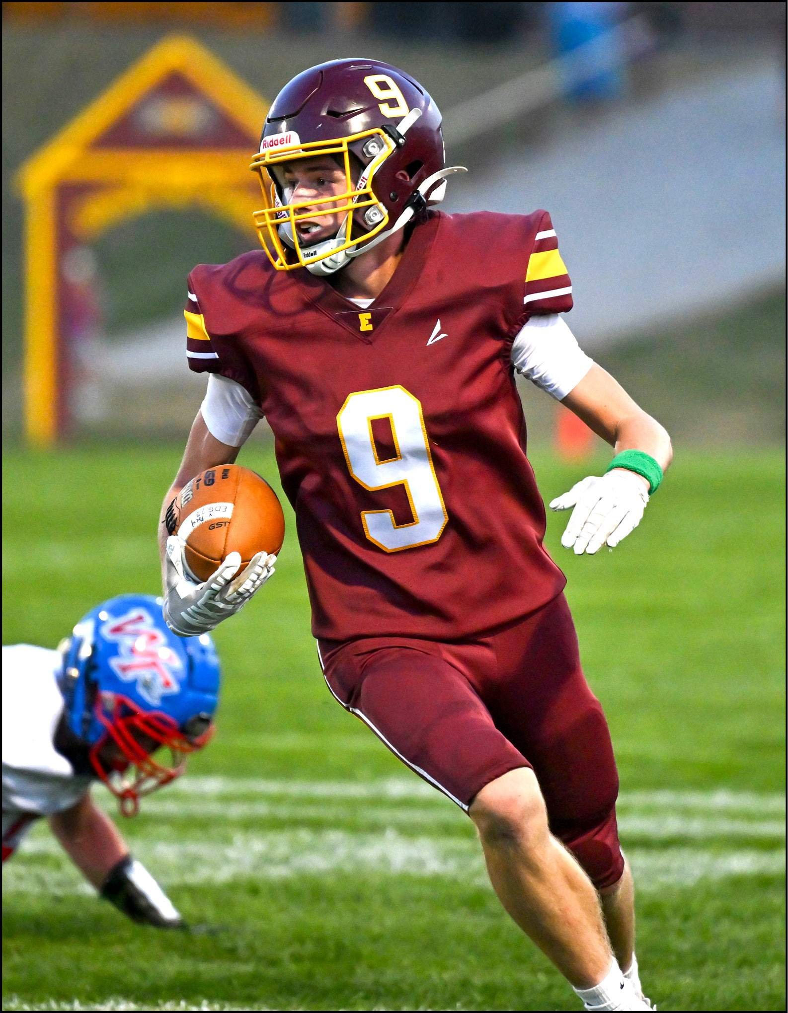 YARDS AFTER CATCH … Edgerton’s Parker Elden looks for blocks after a reception.