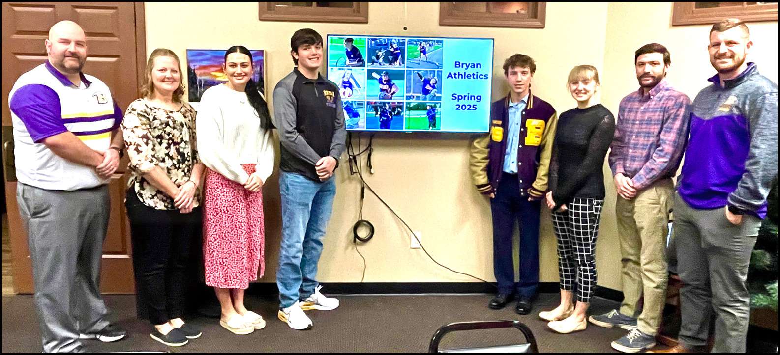 SPRING SPORTS PREVIEW … Bryan High School spring athletes and coaches were guests of the Bryan Rotary Club. Athletic Director Nathan Keel gave an overview of the spring schedule that includes four teams in action. Coaches Hilary Staten, Corey Walker and Adam Swisher spoke about their teams for this year. They are appreciative of community support. Athletes Thea Staten – softball, Landon Bassett – tennis and baseball, Braydon Buchanan – track, and Chloe Spisak – track shared their goals for the season. Pictured are Athletic Director Nathan Keel, Softball Coach Hilary Staten, Thea Staten, Landon Bassett, Braydon Buchanan, Chloe Spisak, Baseball Coach Corey Walker, Tennis Coach Adam Swisher.