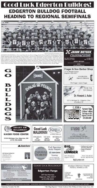 Share Facebook Twitter LinkedIn Pinterest EmailGood Luck In Round Two Playoff Action Edgerton Bulldogs From Your Friends At The Village Reporter & These Area Businesses!Pick Up Your Keepsake Print Edition (Click)