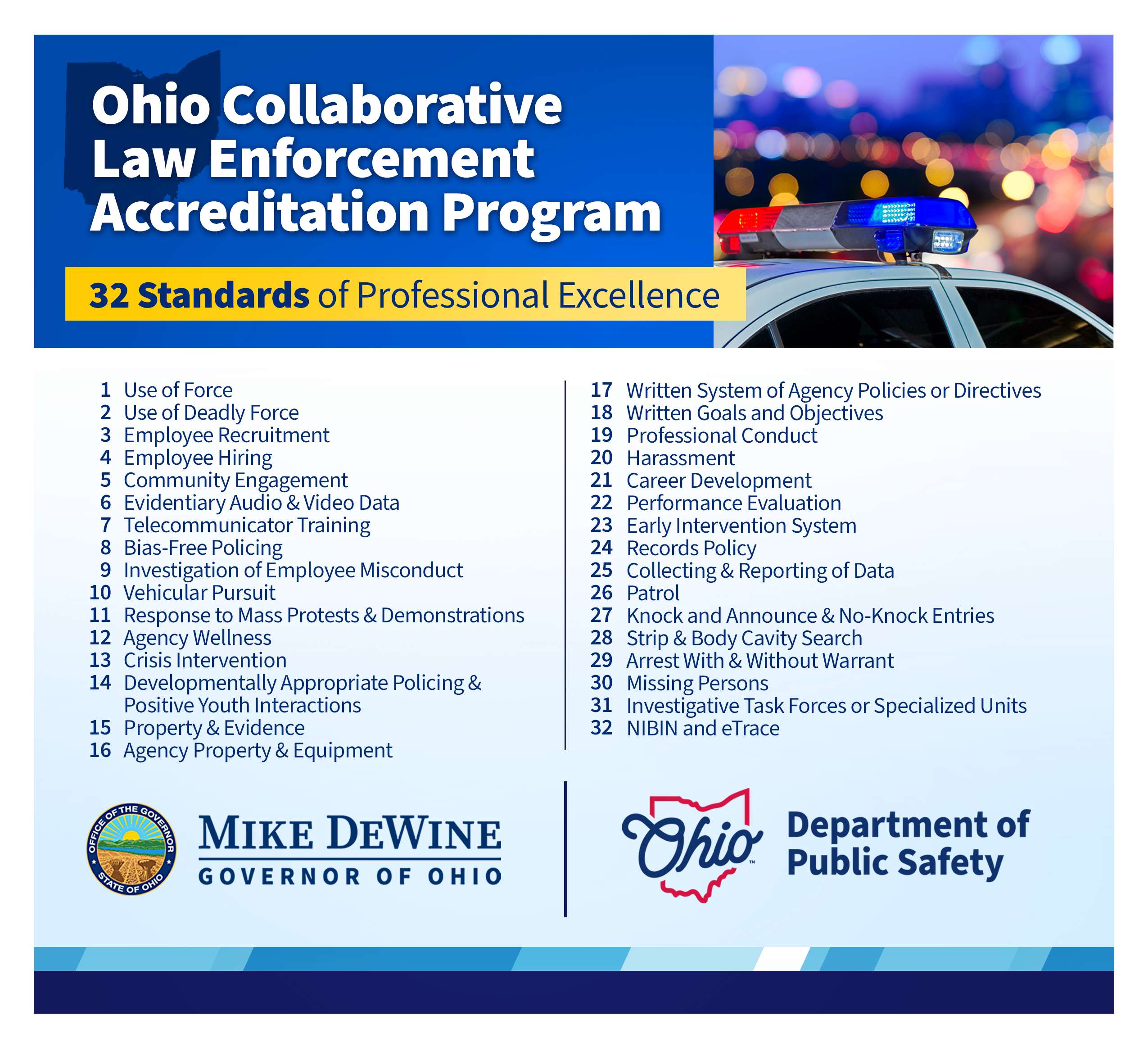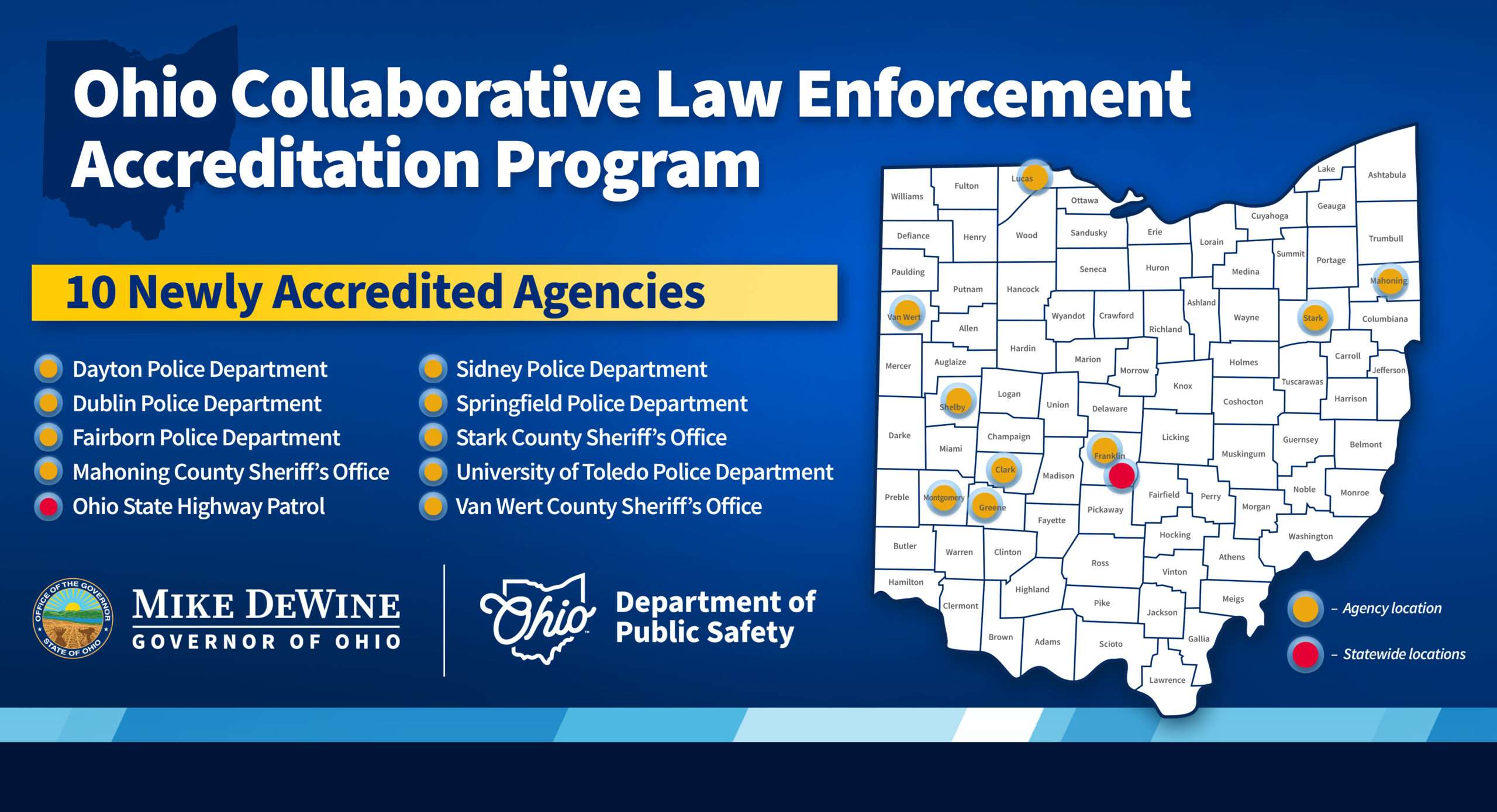 PRESS RELEASE – Ohio Governor Mike DeWine has announced that 10 Ohio law enforcement agencies are now the first in the state to complete the new Ohio Collaborative Law Enforcement Accreditation Program.