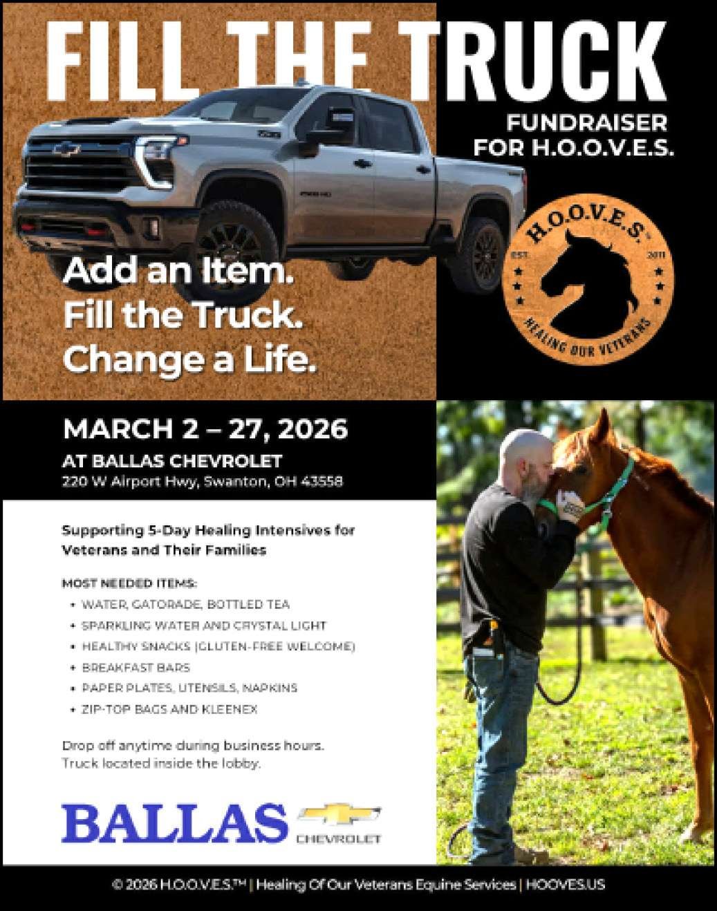 Throughout March, Ballas Automotive will serve as a community collection site for essential items directly supporting veterans attending H.O.O.V.E.S. intensive programs, as well as the daily care of the rescue herd. Joint awareness and engagement efforts between the organizations will highlight the impact of equine-assisted services for those who have served.