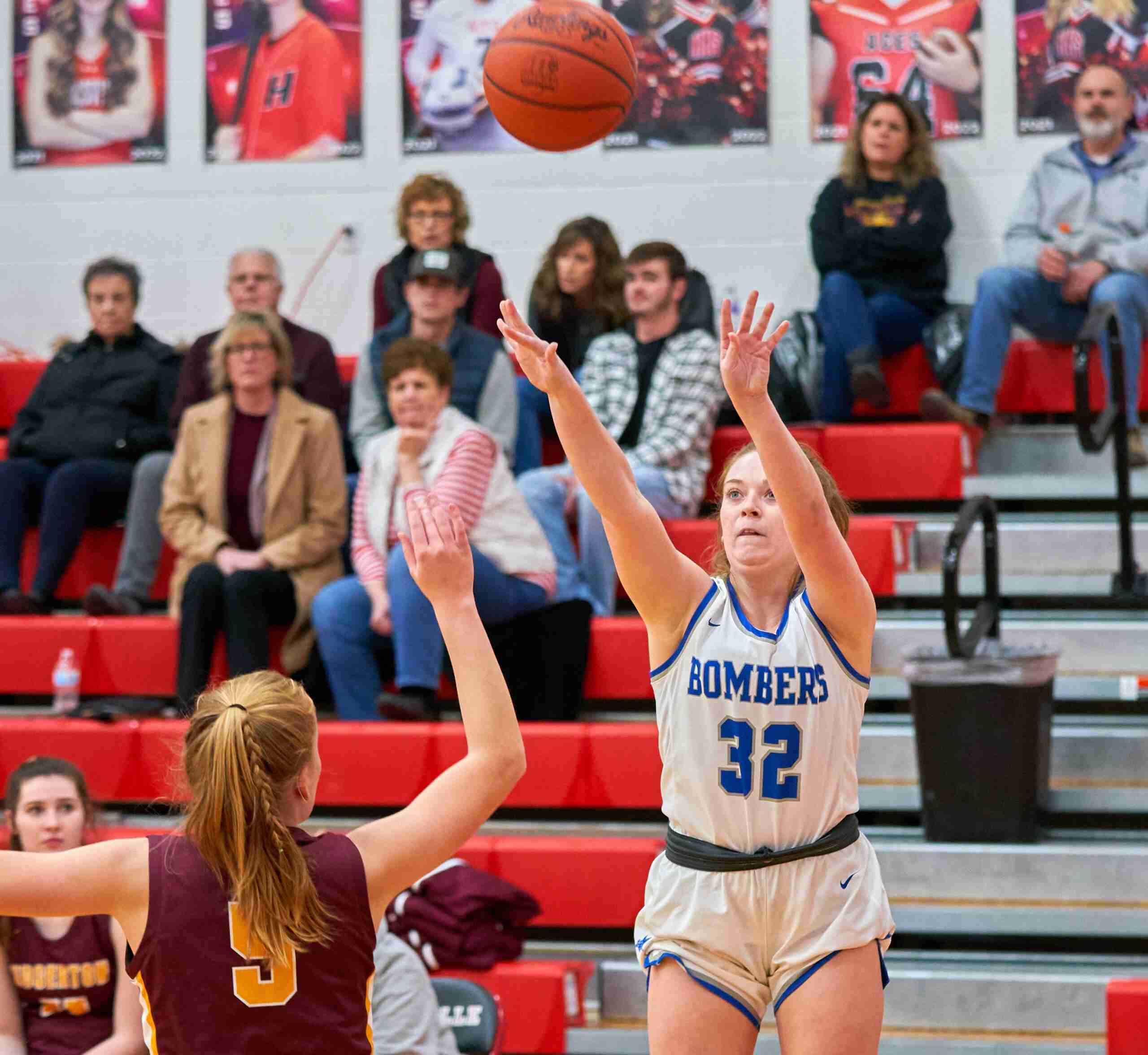 FIRST WIN OF THE SEASON … Edon’s Carlie Kiess puts up a three-pointer against Edgerton in the consolation game of the Route 49 Classic at Hicksville. Kiess tallied 21 points on the night to lead the Lady Bombers to their first win of the season. (PHOTO BY RICH HARDING, STAFF)
