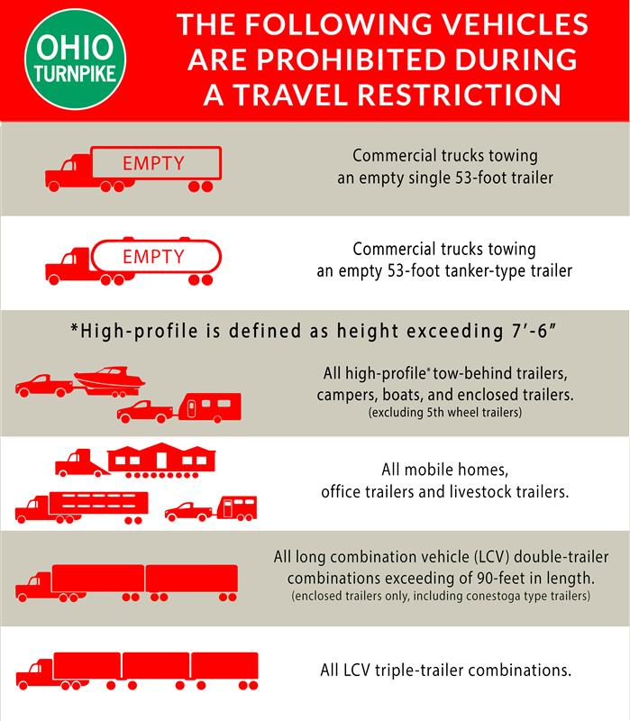 The following types of vehicles ARE PROHIBITED from traveling on the Ohio Turnpike during the travel restriction period: