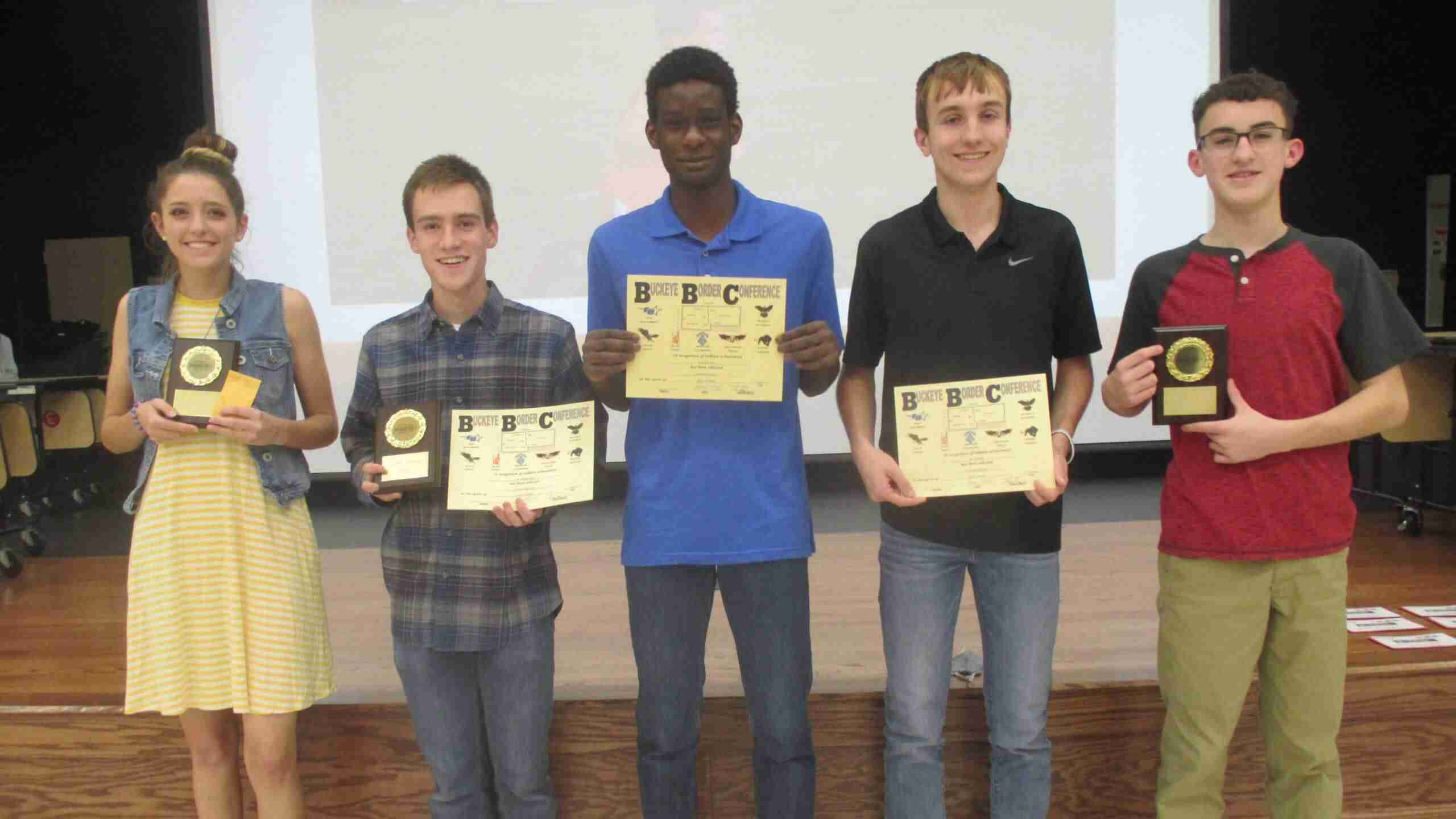 CROSS COUNTRY … Jackie Wagner-Most Improved Female and Cadet Award; Joe Reamsnyder-BBC Scholar-Athlete and Cadet Award; Matthew Wyse-BBC Scholar-Athlete; Ian Hoffman-BBC Scholar-Athlete; Aiden Funkhouser-Most Improved Male. (PHOTO PROVIDED)