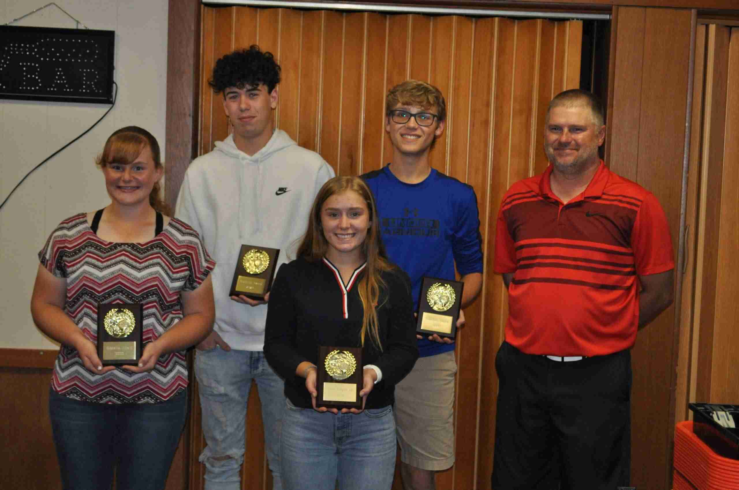 TOP AWARDS … Jamie Chester-Girls Medalist,  Karter Gray-Boys Medalist, Ella Calvin-Most Improved, Ethan Siebenaler-Coach’s Award & Coach Turner.
