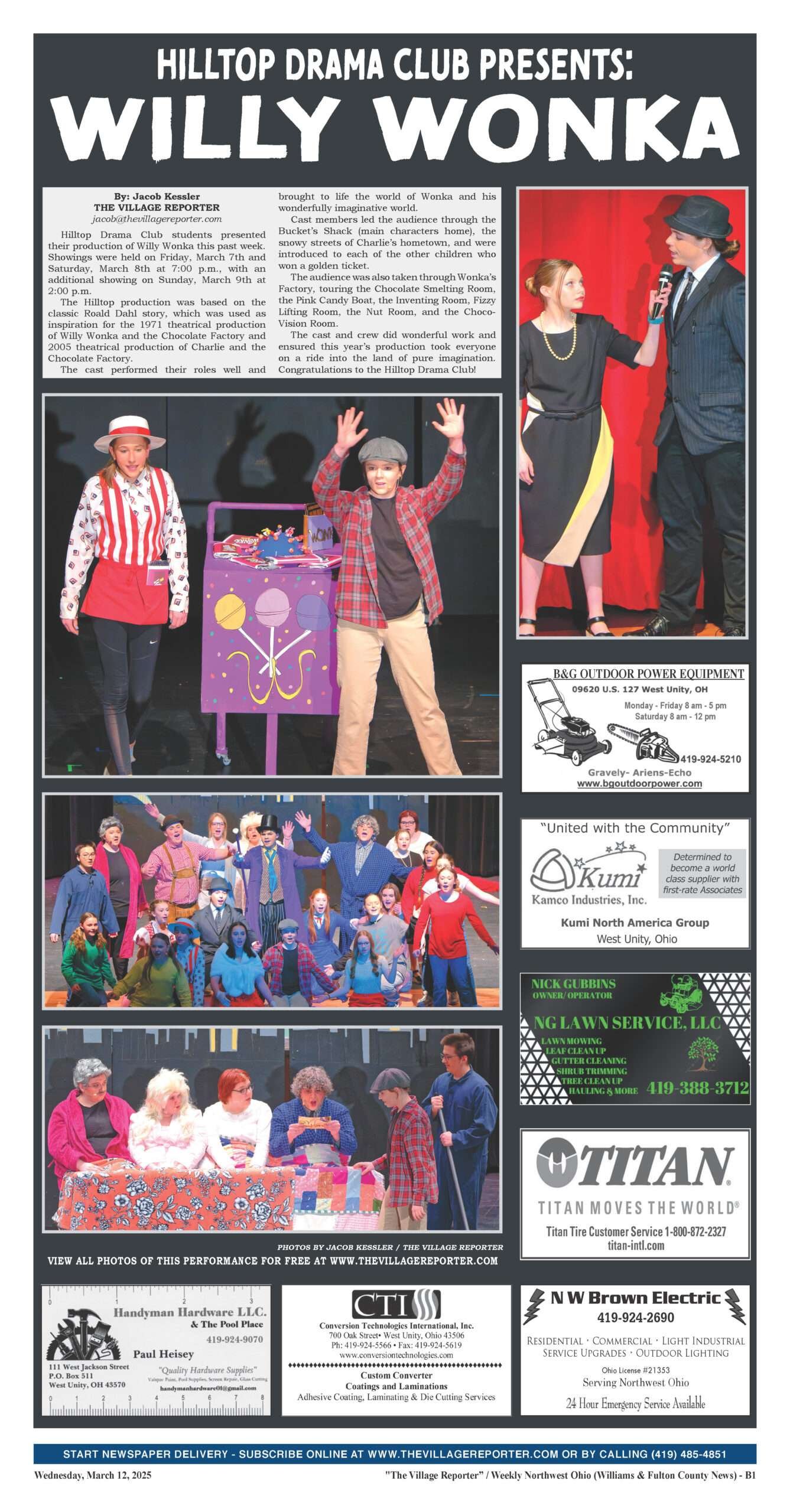Hilltop Drama Club students presented their production of Willy Wonka this past week. Showings were held on Friday, March 7th and Saturday, March 8th at 7:00 p.m., with an additional showing on Sunday, March 9th at 2:00 p.m.