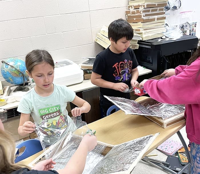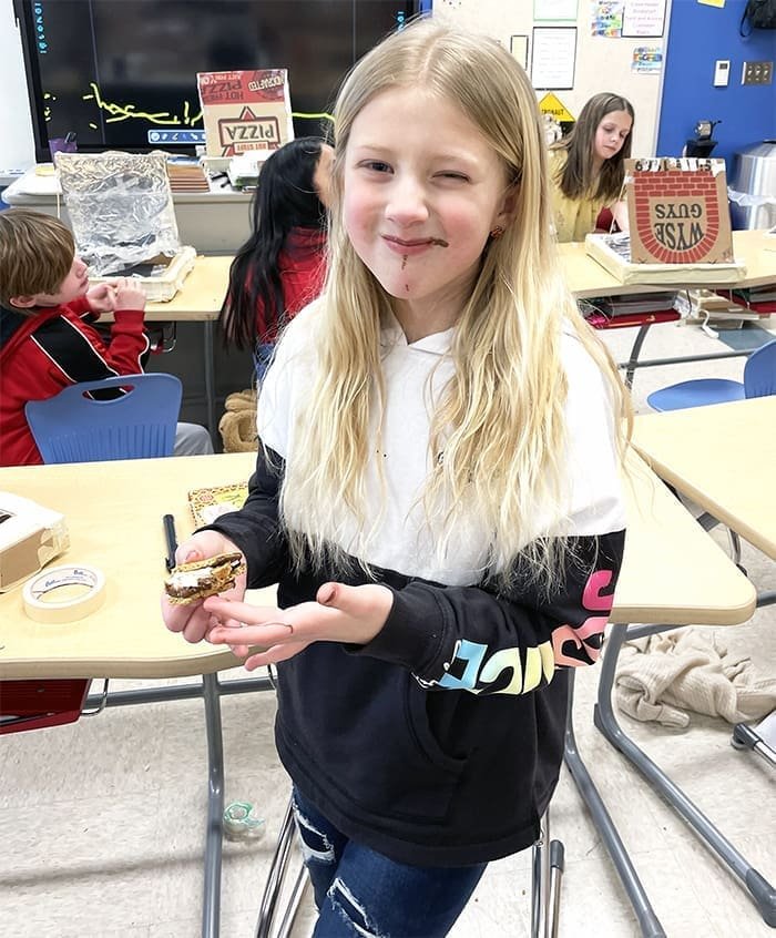 SCIENCE LESSONS … Hilltop 4th graders recently took part in several activities with their teacher Mr. Leu. One activity was that they constructed and used solar cookers to cook smores. With temperatures in the 30’s outdoors some of their cookers reached up to 136 degrees. They also learned about electricity in different ways. One way was creating series and parallel circuits using wires, bulbs, switches, and batteries. Another way was pedaling a bicycle with a generator to light up different electrical items. Then with a few electrical kits students were able to create multiple projects. The class also had fun learning about static electricity, using balloons to pick up different items, and a plastic stick to float plastic around the room.