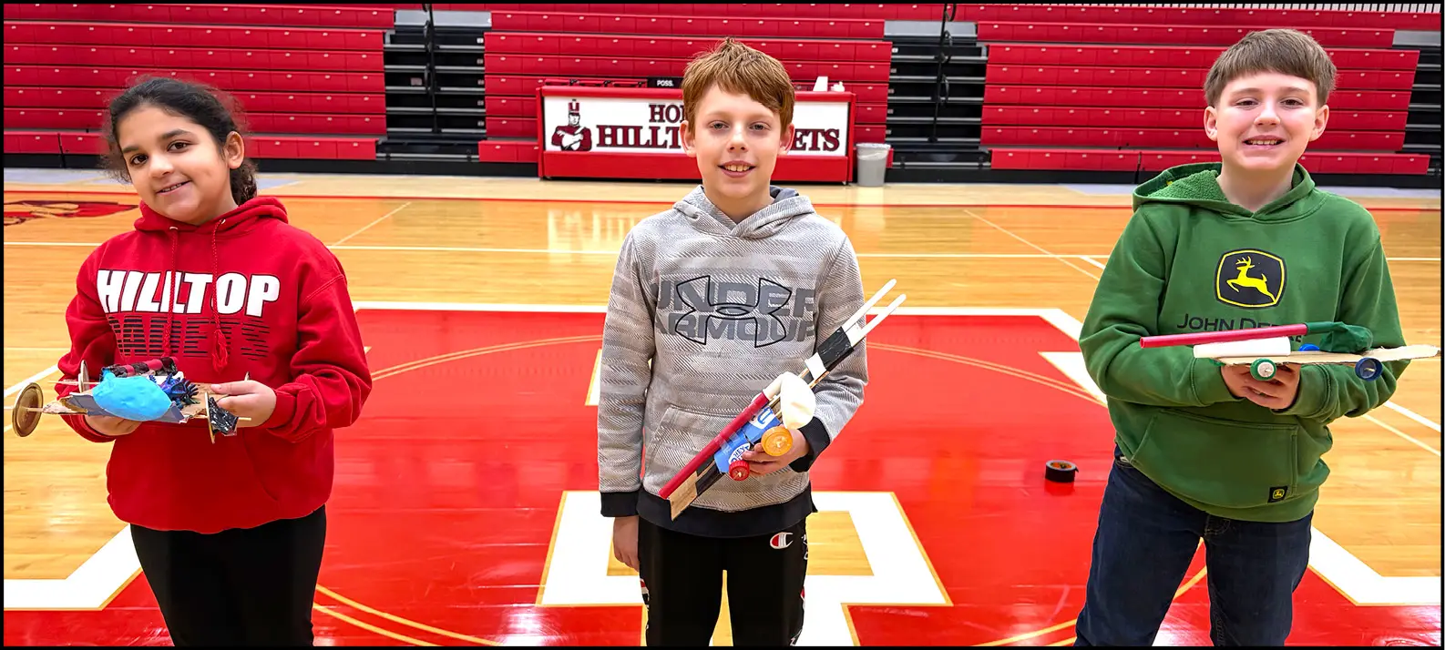 Hilltop 4th graders are seen here after racing balloon cars they each created. After discussing energy, forces, and engineering design, students used what they had learned to create their own balloon cars. The goal was to determine whose car would go the farthest.