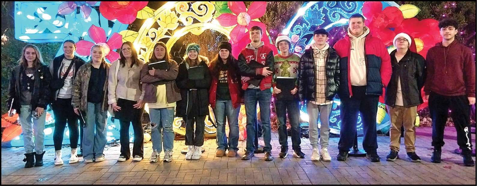 SONGS OF THE SEASON … On Sunday evening, December 15, members of the Hilltop HS choir traveled to the Toledo Zoo to sing Christmas carols as they strolled through the beautiful lights. Zoo goers were very appreciative of their efforts. Pictured from left: Jazmyn Castillo-Edelman, Raelee Rasey, Marley Martin, Brooklyn Gault, Araiah Yates, Addi Riley, Maci Roth, Arend Schuurman, Ian Hansen, Aryan Shaffer, Noah White, Brayden Tyler, and Akay Karadeniz.